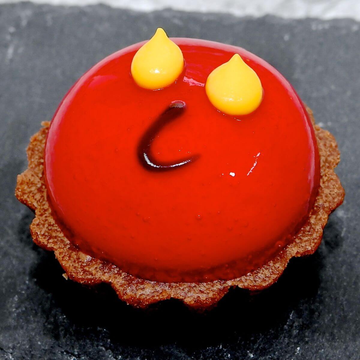 クッキーとデールのお鼻の赤いソースがトッピングされたキャラメルムースのタルトです。