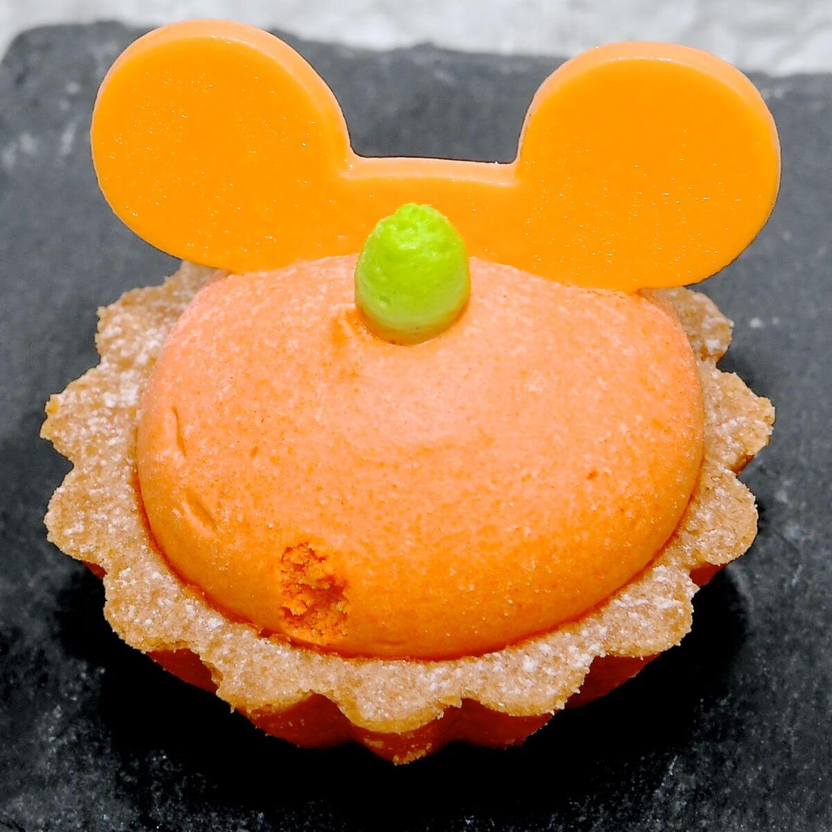 ハロウィーンらしく、ジャック・オ・ランタン(かぼちゃおばけ)の形をしたプチケーキ「かぼちゃクリームのタルト」