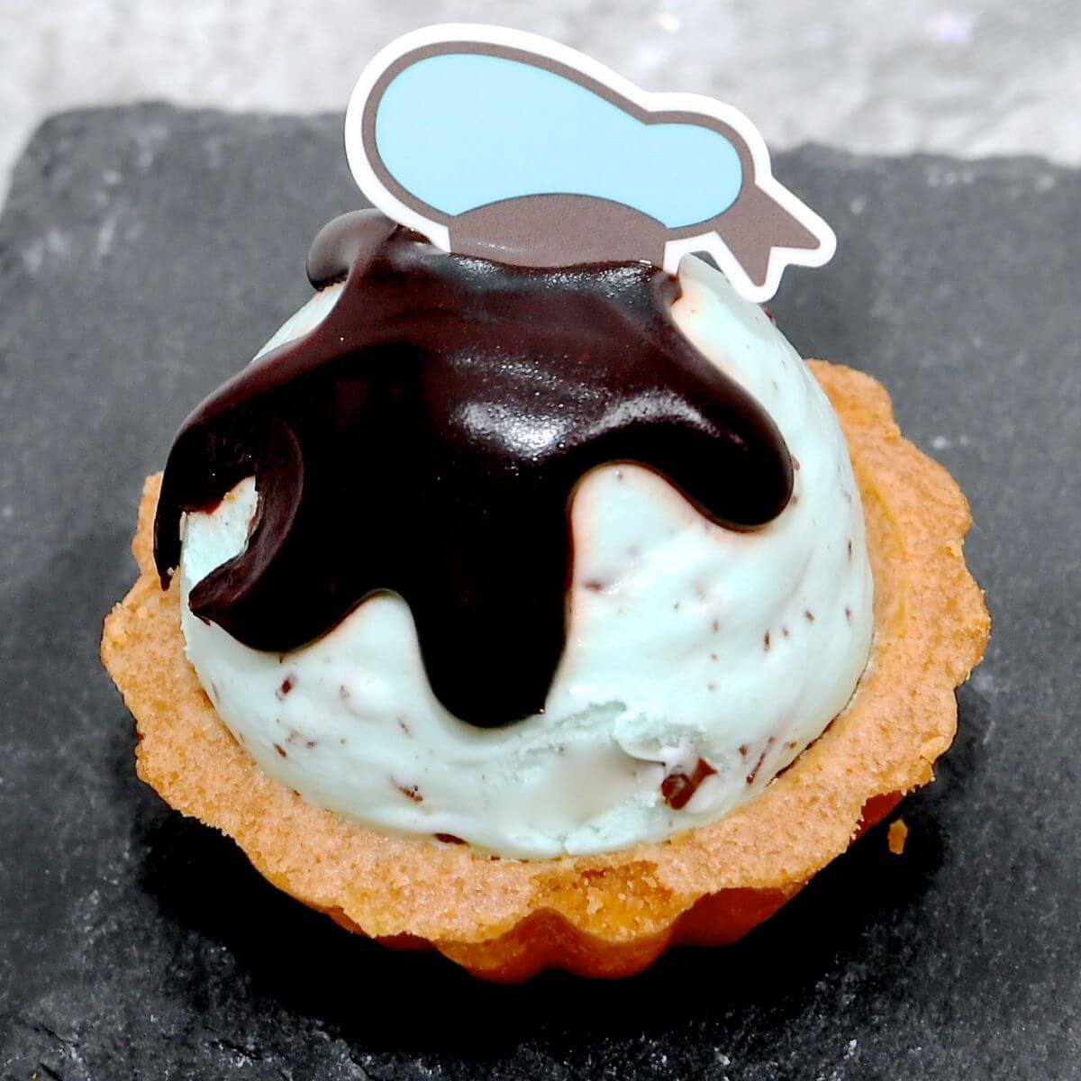 チョコミントアイスをイメージした<ドナルドダック>のプチケーキは「チョコチップ入りミント風味クリームのタルト」