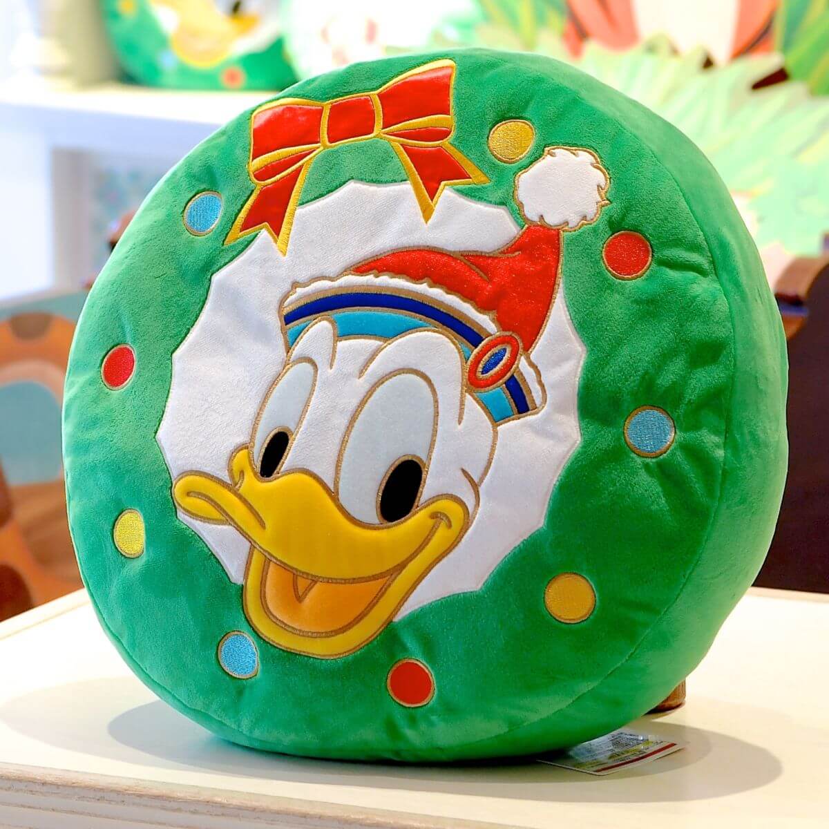 リースデザインの円形クッションにドナルドとプルートのお顔がデザインされています。
