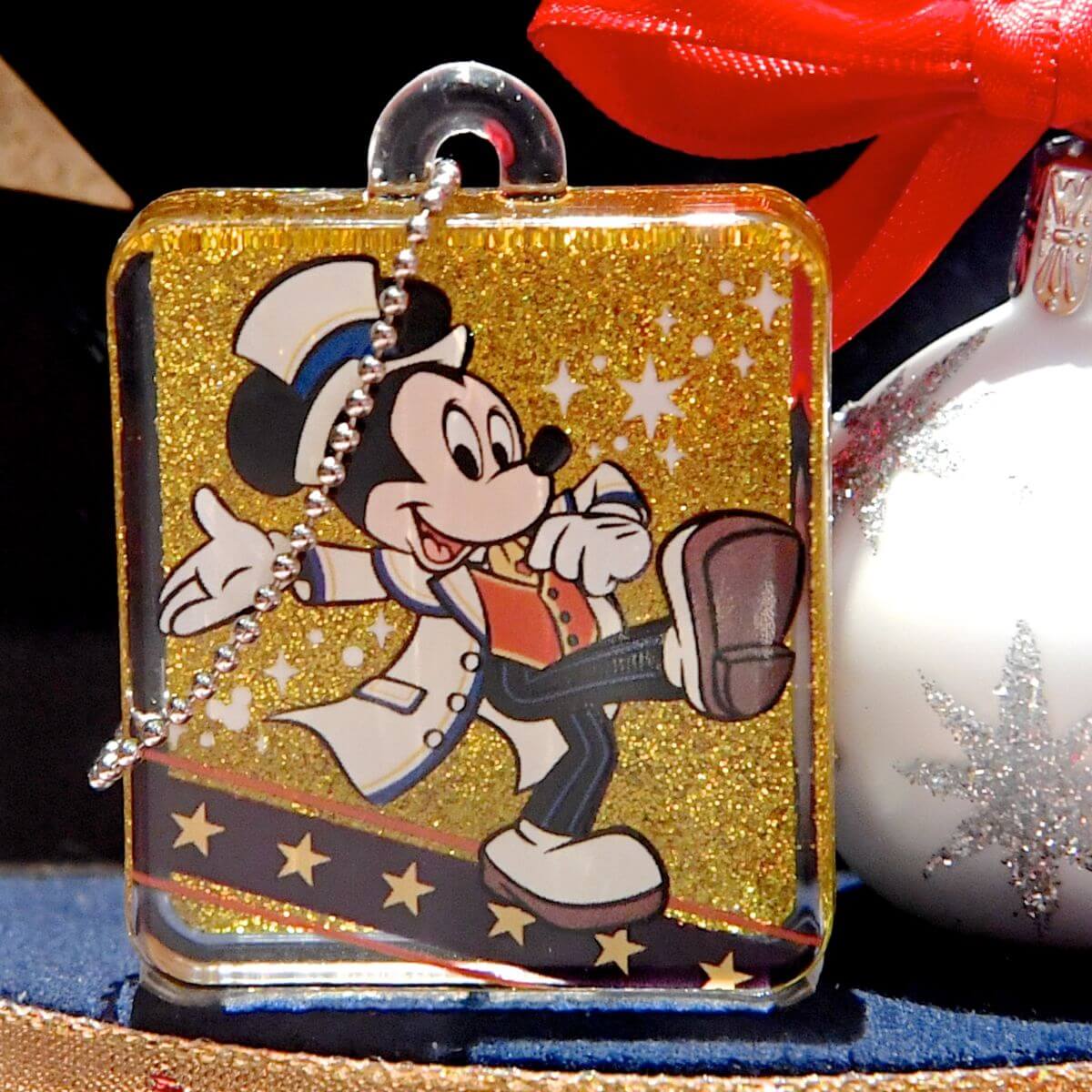 華麗に踊るミッキーたちがデザインされたキラキラかわいいキーチェーンのカプセルトイ。