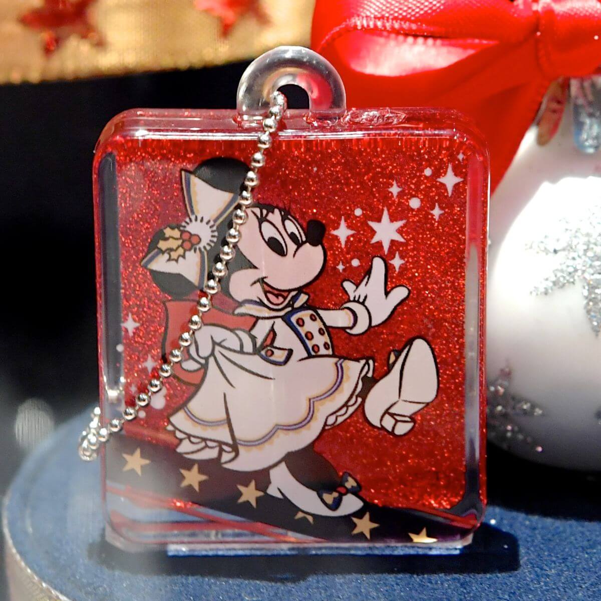 同じくラインダンスするミニーがデザインされた赤色のキーチェーン。