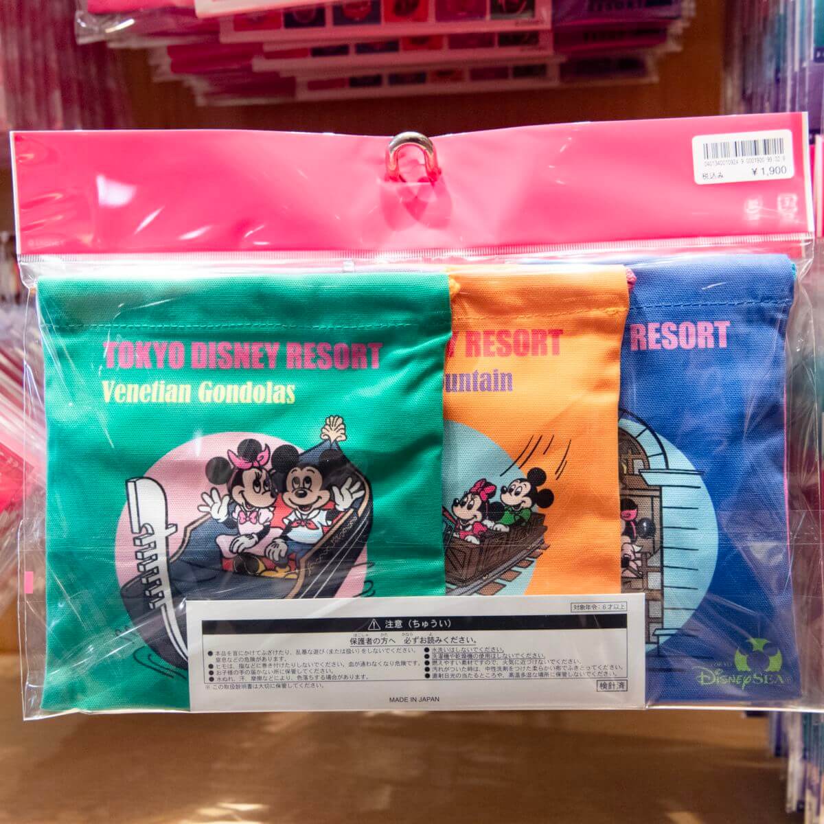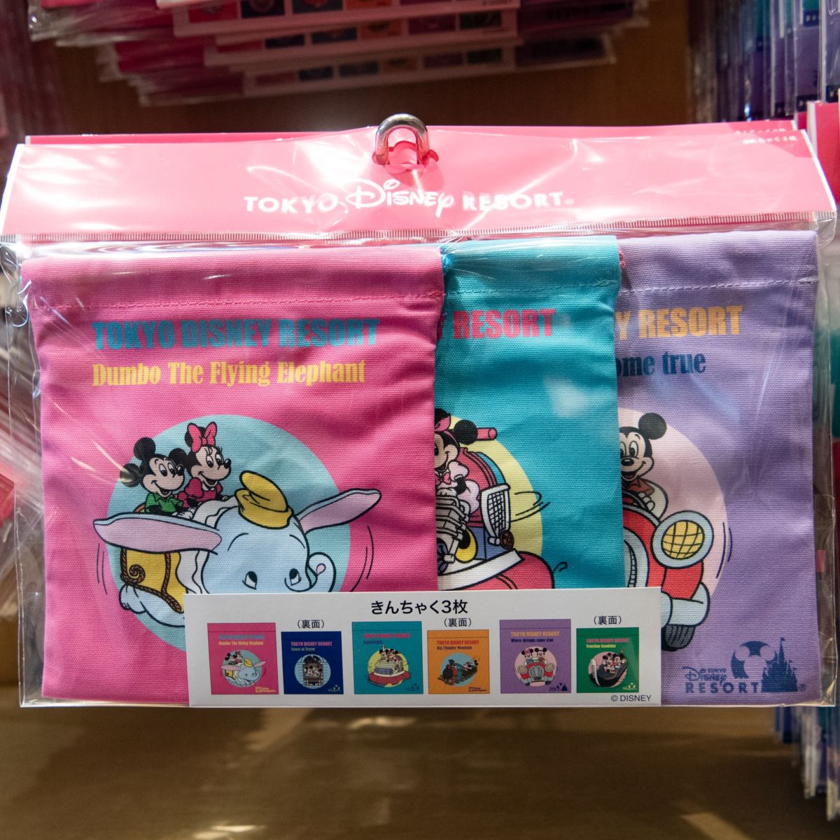 空飛ぶダンボ&タワー・オブ・テラー、アクアトピア&ビッグサンダー・マウンテン、ミッキーの愛車&ヴェネツィアン・ゴンドラデザインのきんちゃく3枚セット。