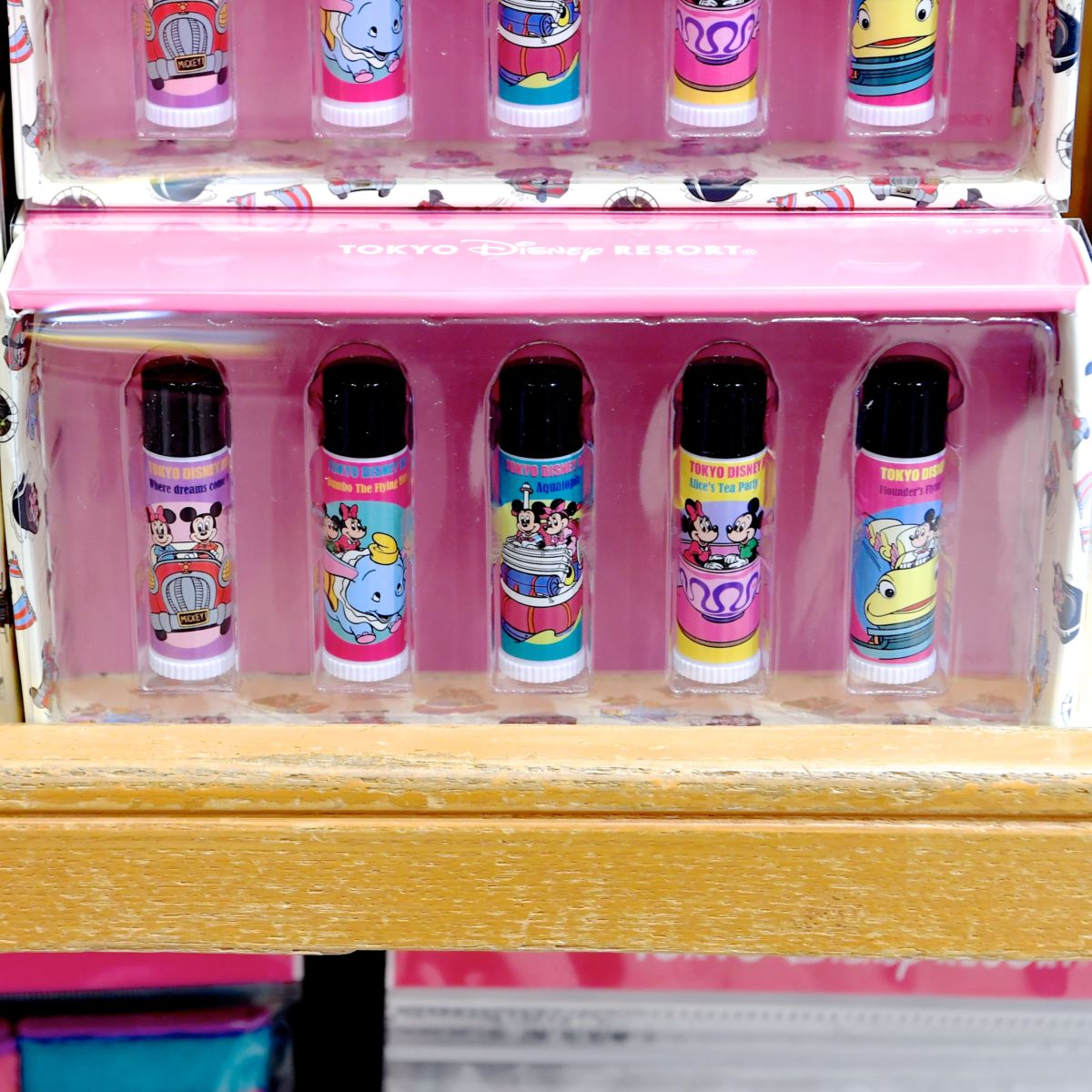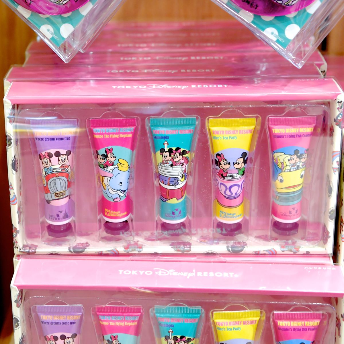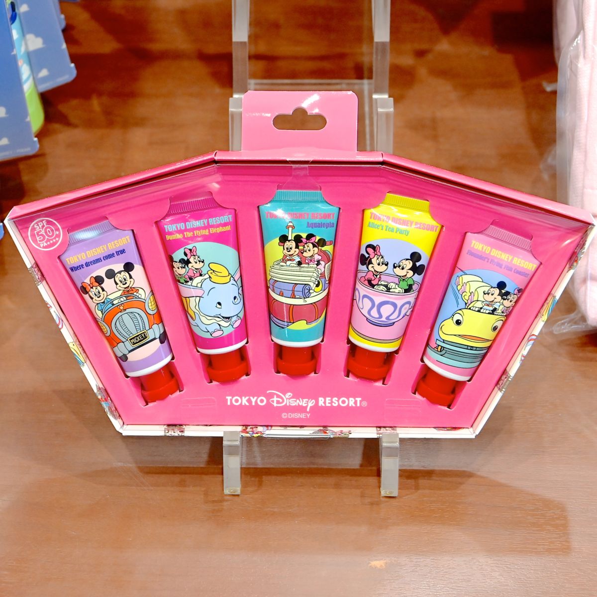 ミッキーマウスの愛車、空飛ぶダンボ、アクアトピア、アリスのティーパーティー、フランダーのフライングフィッシュコースターにのるミッキーマウスとミニーマウスがデザインされた日焼け止め5本セット、ボックス入り☆