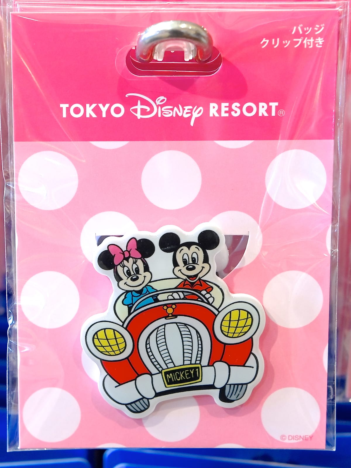 ミッキーの愛車にのるミッキーマウスとミニーマウスがデザインされたバッジ。