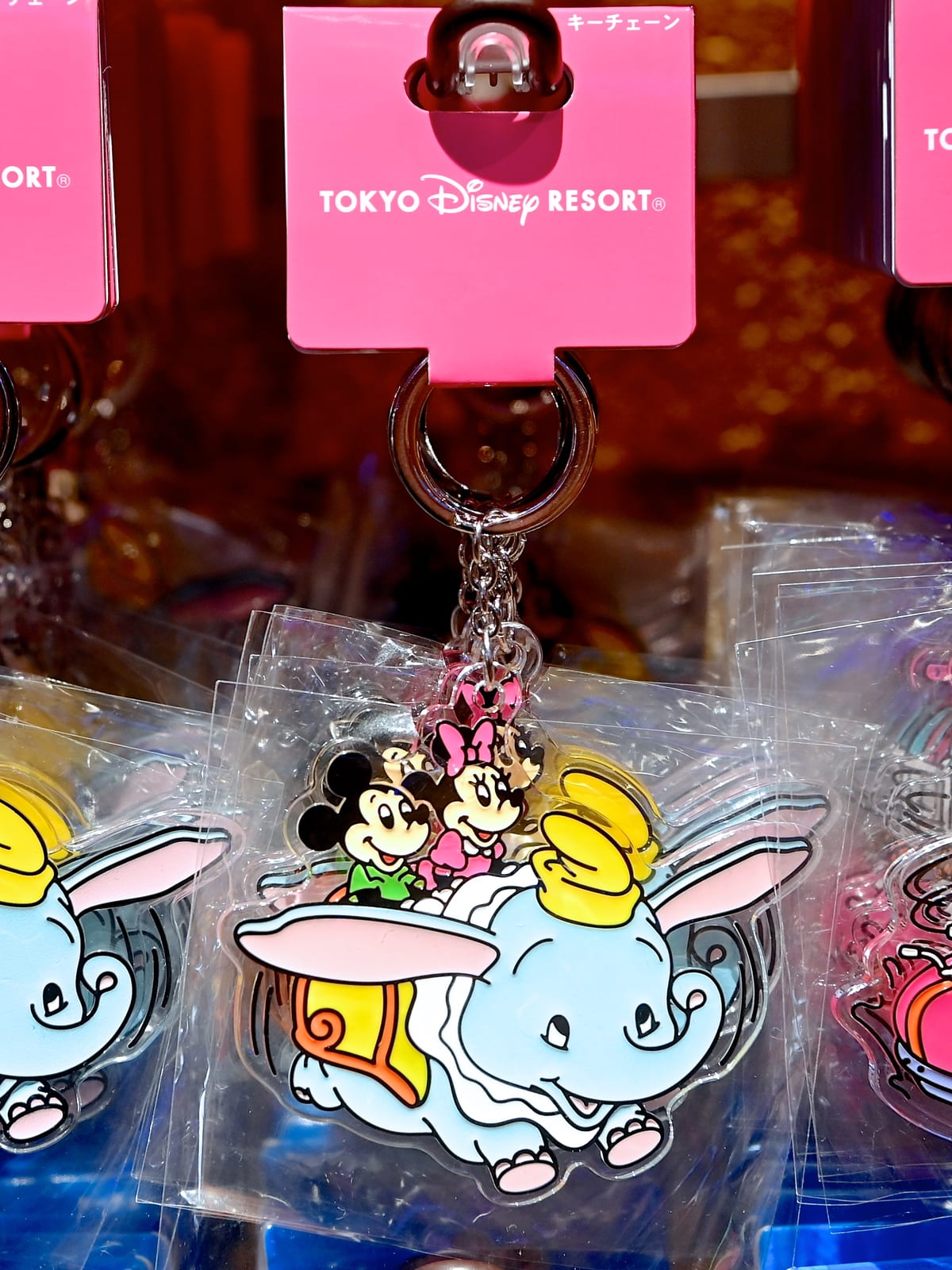 空飛ぶダンボに乗るミッキーマウスとミニーマウスがデザインされたアクリルキーチェーン。