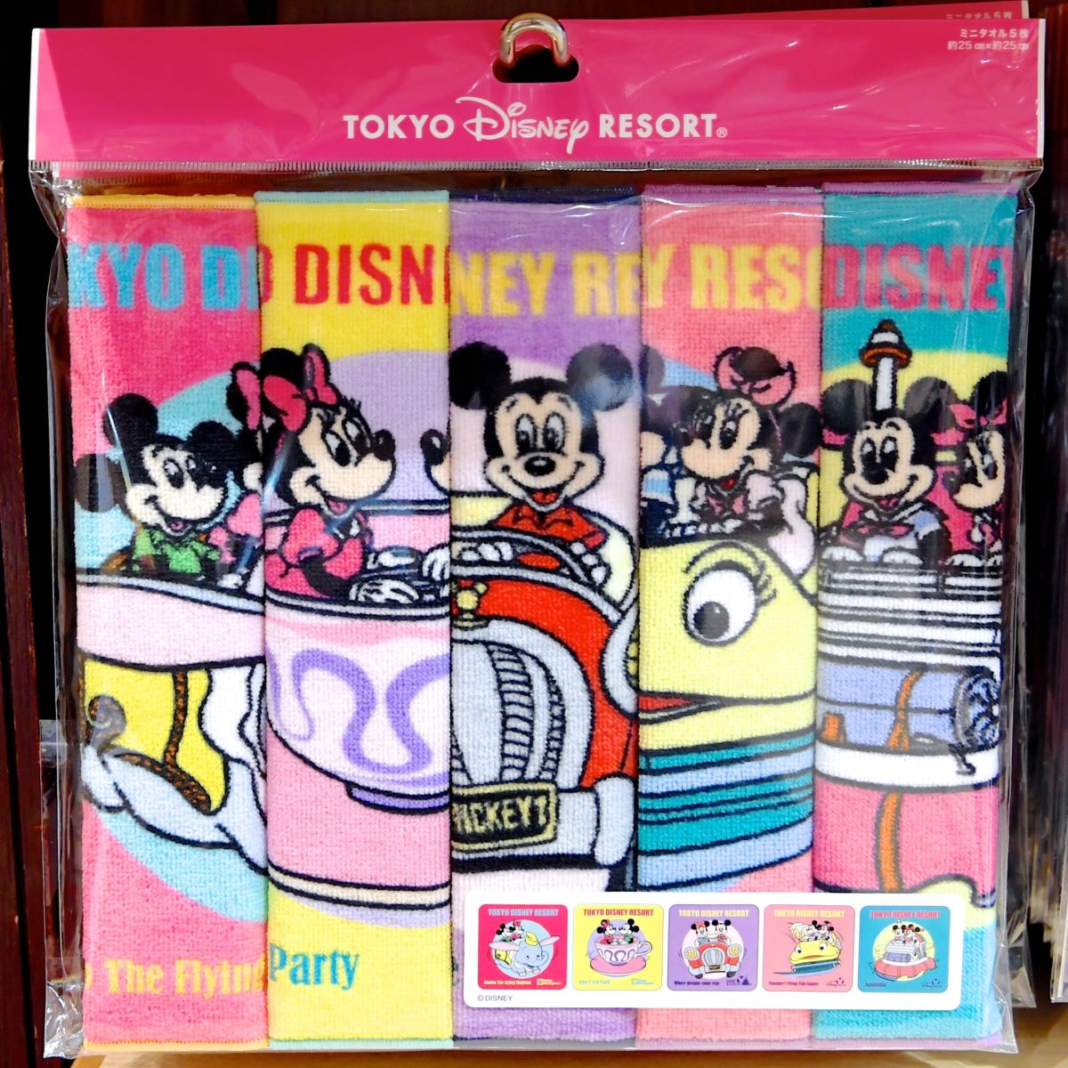 ミッキーの愛車、「アリスのティーパーティー」「空飛ぶダンボ」「アクアトピア」「フランダーのフライングフィッシュコースター」に乗るッキーマウス、ミニーマウスがかわいいミニタオル5枚セット。