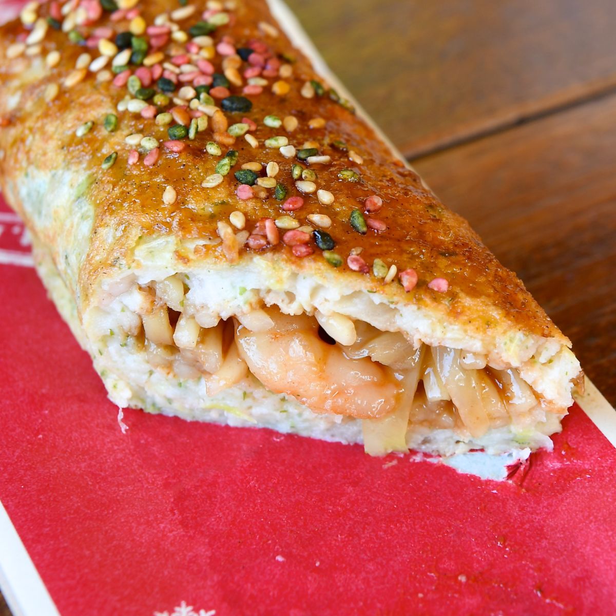 フードプログラム「テイスト・オブ・クリスマス」にあわせて、ソースの香りが食欲をそそる、焼きそば入りのお好み焼きロールが初登場!