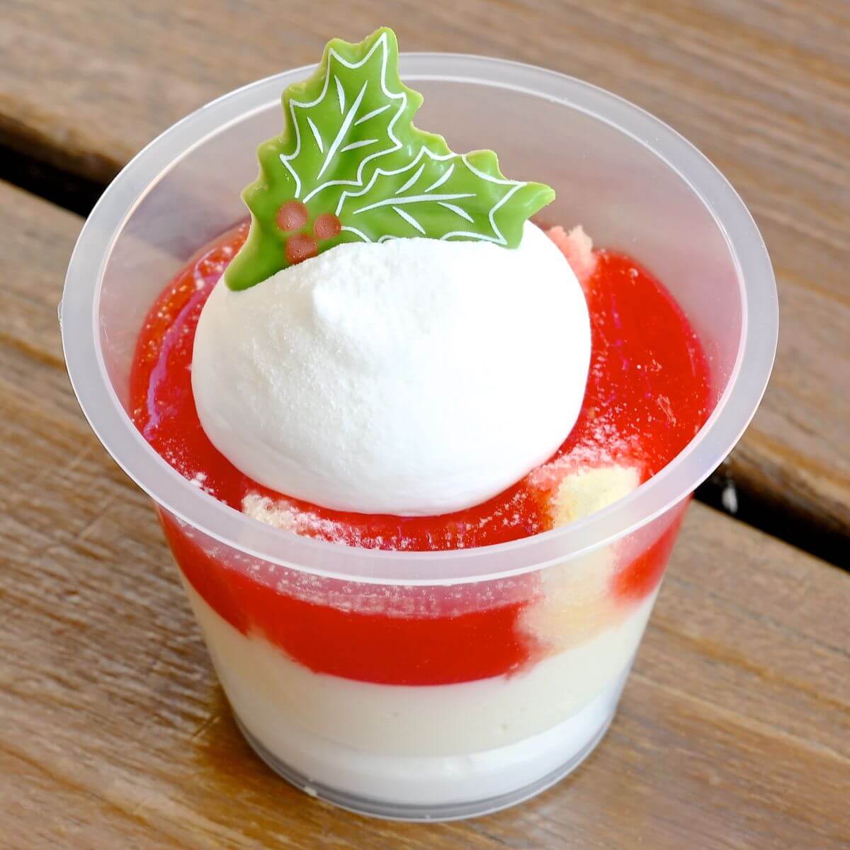 まるでいちごのショートケーキのようなカップデザートは、甘酸っぱいストロベリーソースと柊型のチョコレートがトッピングされた「ストロベリーデザート」