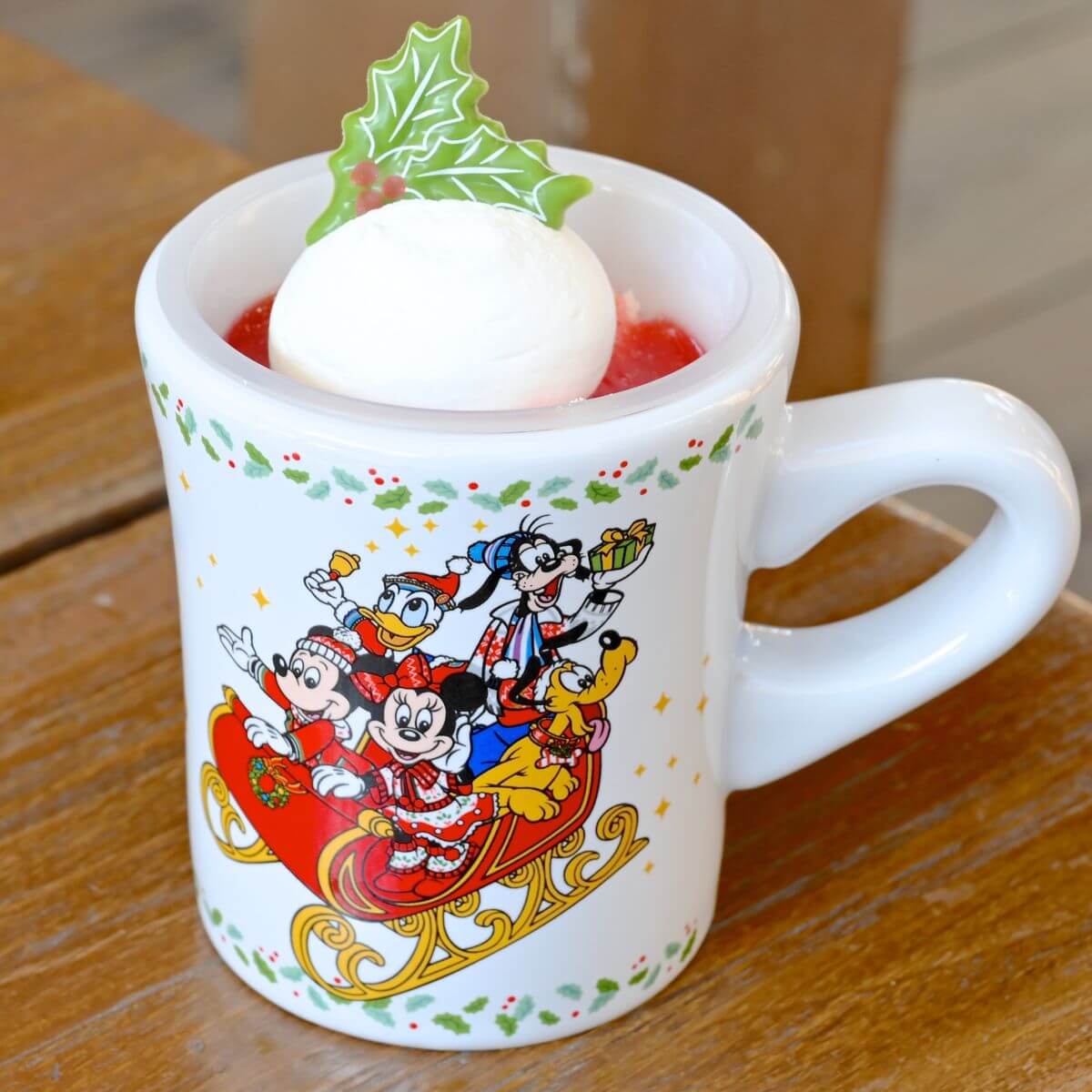 スーベニアカップはソリに乗ったミッキーマウス、ミニーマウス、ドナルドダック、グーフィー、プルートがデザインされています。