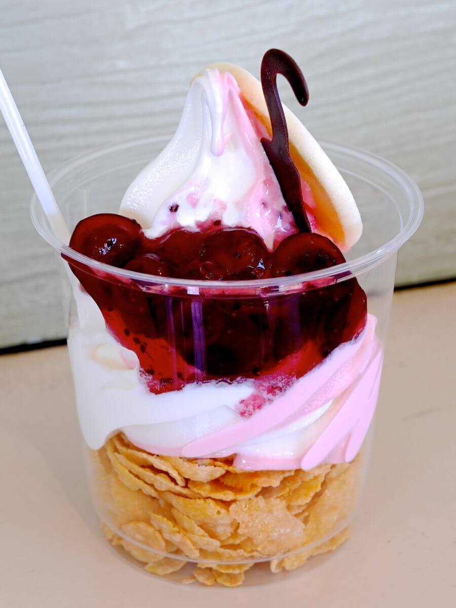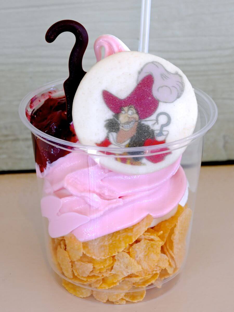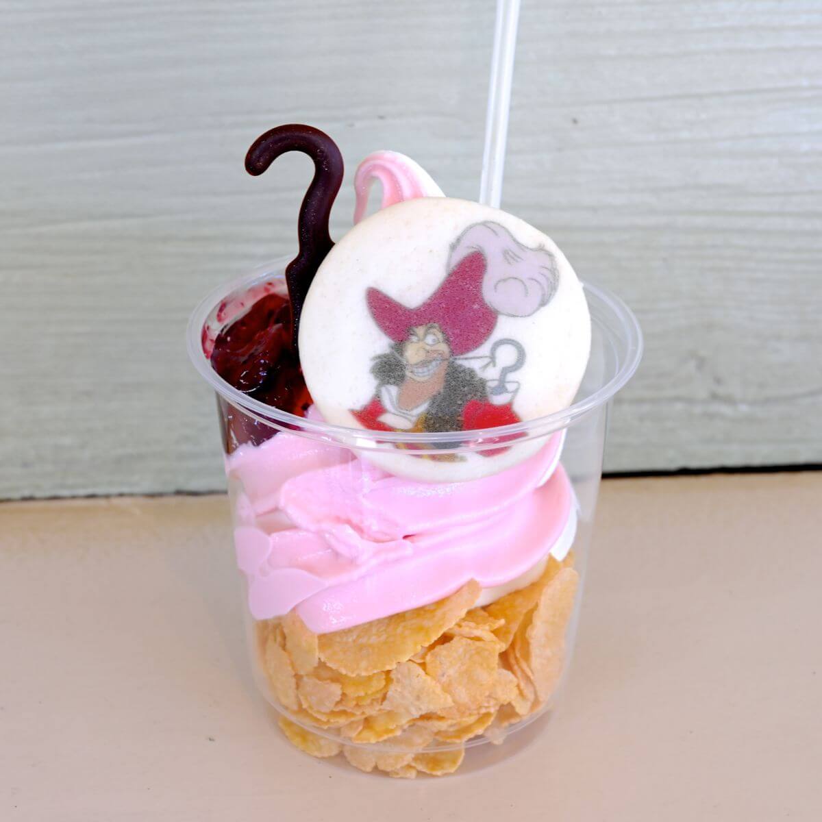 ストロベリーとバニラのミックスソフトクリームに、フック船長カラーのえんじ色のベリーのソースがたっぷりのったサンデー。