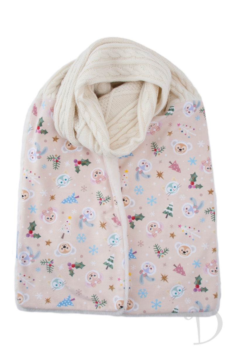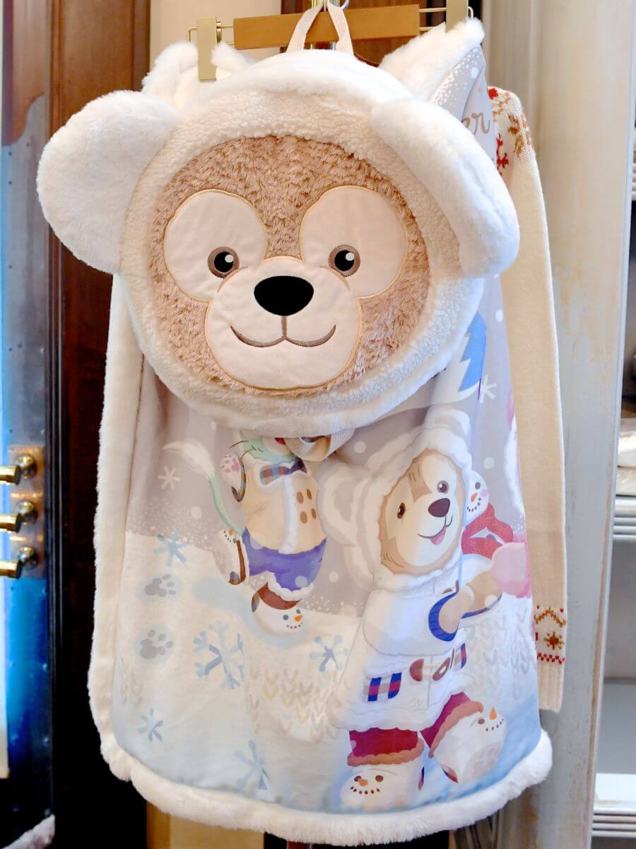 ダッフィーのふわもこかわいいお顔型リュック付きで便利に持ち歩けるブランケット。