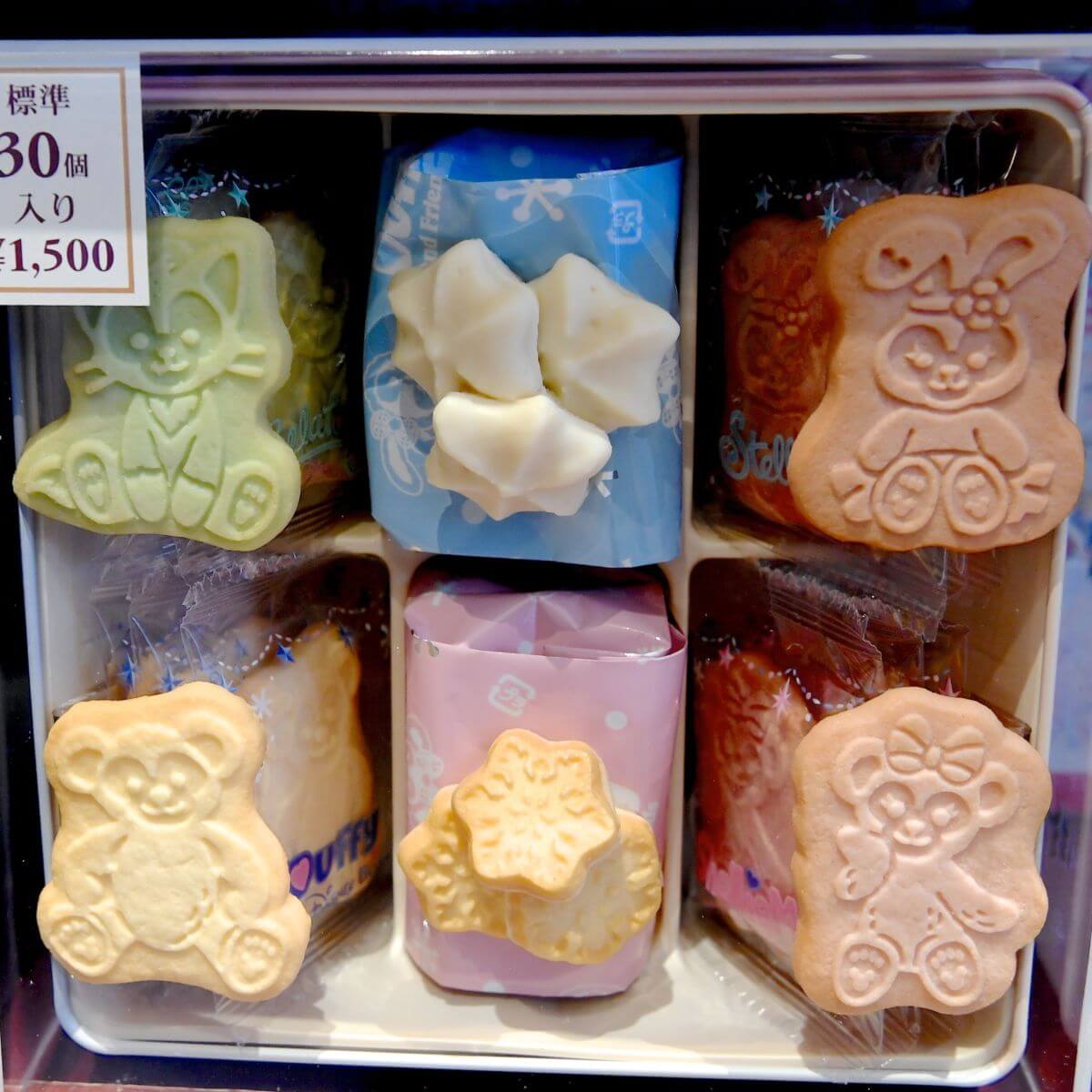 [バタークッキー(ダッフィー型)4個、クランベリークッ キー(シェリーメイ型)4個、グリーンアップルクッキー(ジェラトーニ型)4 個、アップルシナモンクッキー(ステラ・ルー型)4個]、1袋(24g)ホワ イトチョコレート付きバタークッキー(桃色袋)、1袋(24g)ホワイト チョコレートカバードマカロン(青色袋)