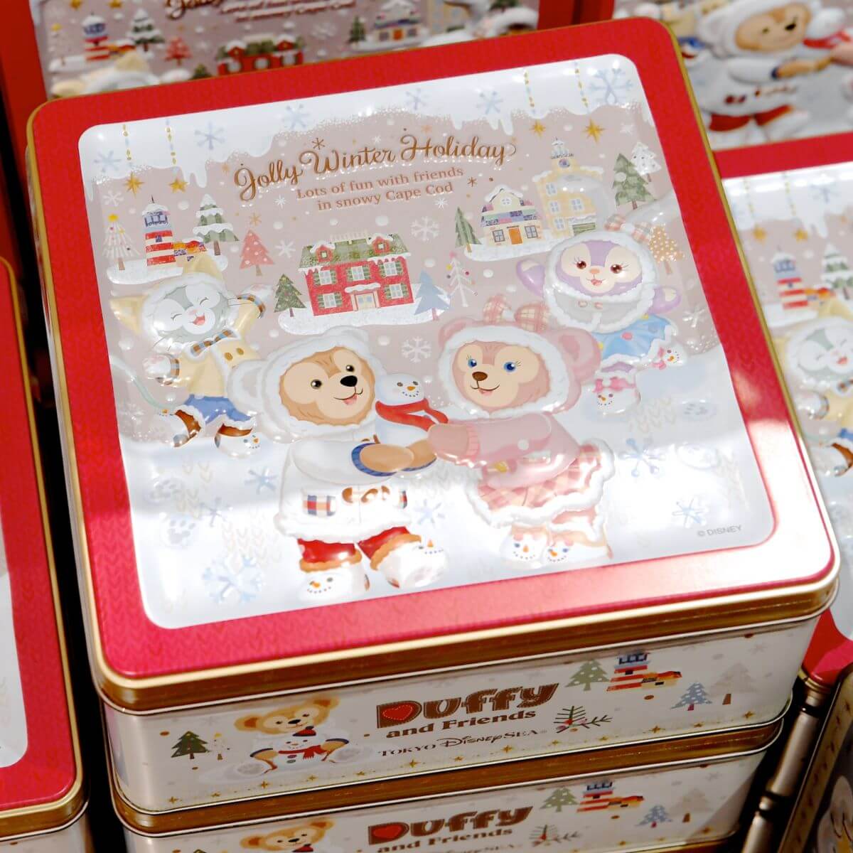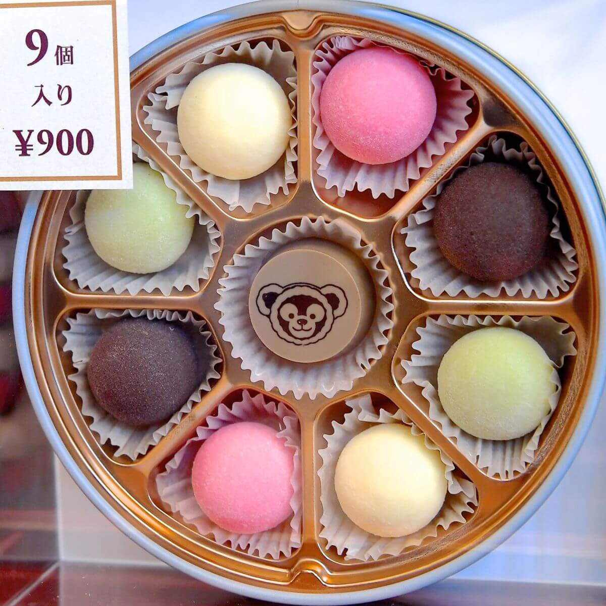 ダッフィー&フレンズがデザインされた丸い缶に入ったチョコレートの詰め合わせ。