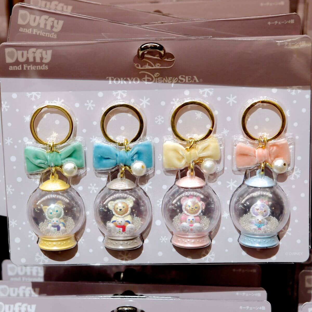 「ダッフィー」「シェリーメイ」「ジェラトーニ」「ステラ・ルー」のスノードームのようなキーチェーンセット。