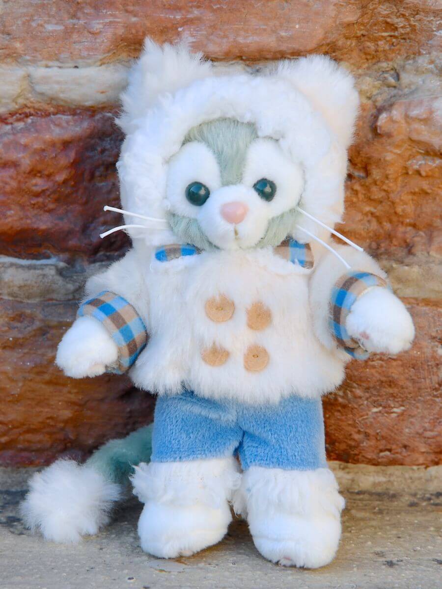ジェラトーニは猫耳が付いたベージュのふわもこコートと青いパンツ。