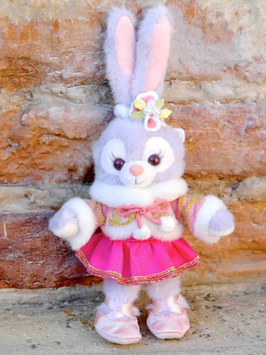 「ステラ・ルー」のぬいぐるみバッジはピンクのコスチュームです。