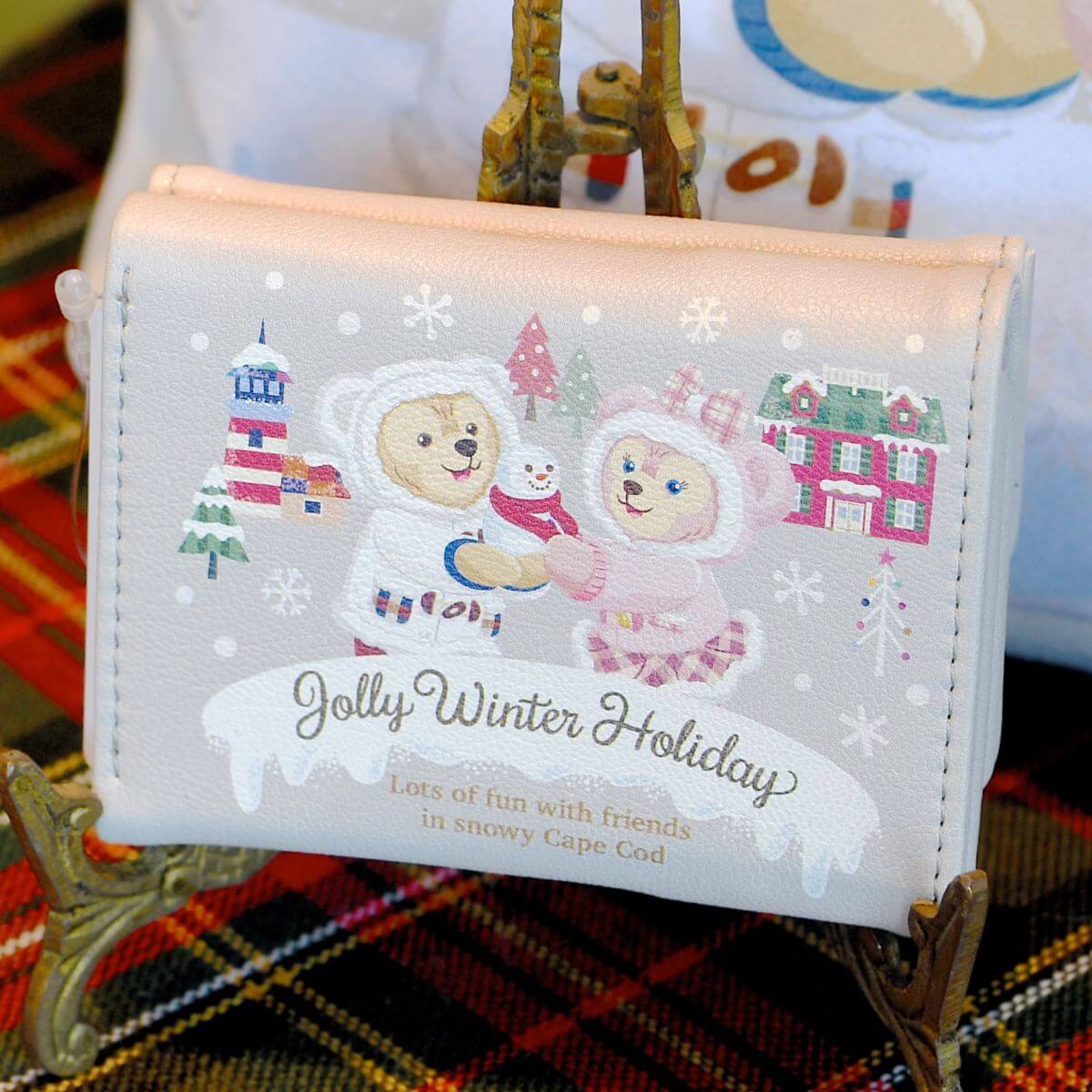 雪だるまを作って楽しむ「ダッフィー」「シェリーメイ」「ジェラトーニ」「ステラ・ルー」の姿がデザインされたコンパクトなお財布。