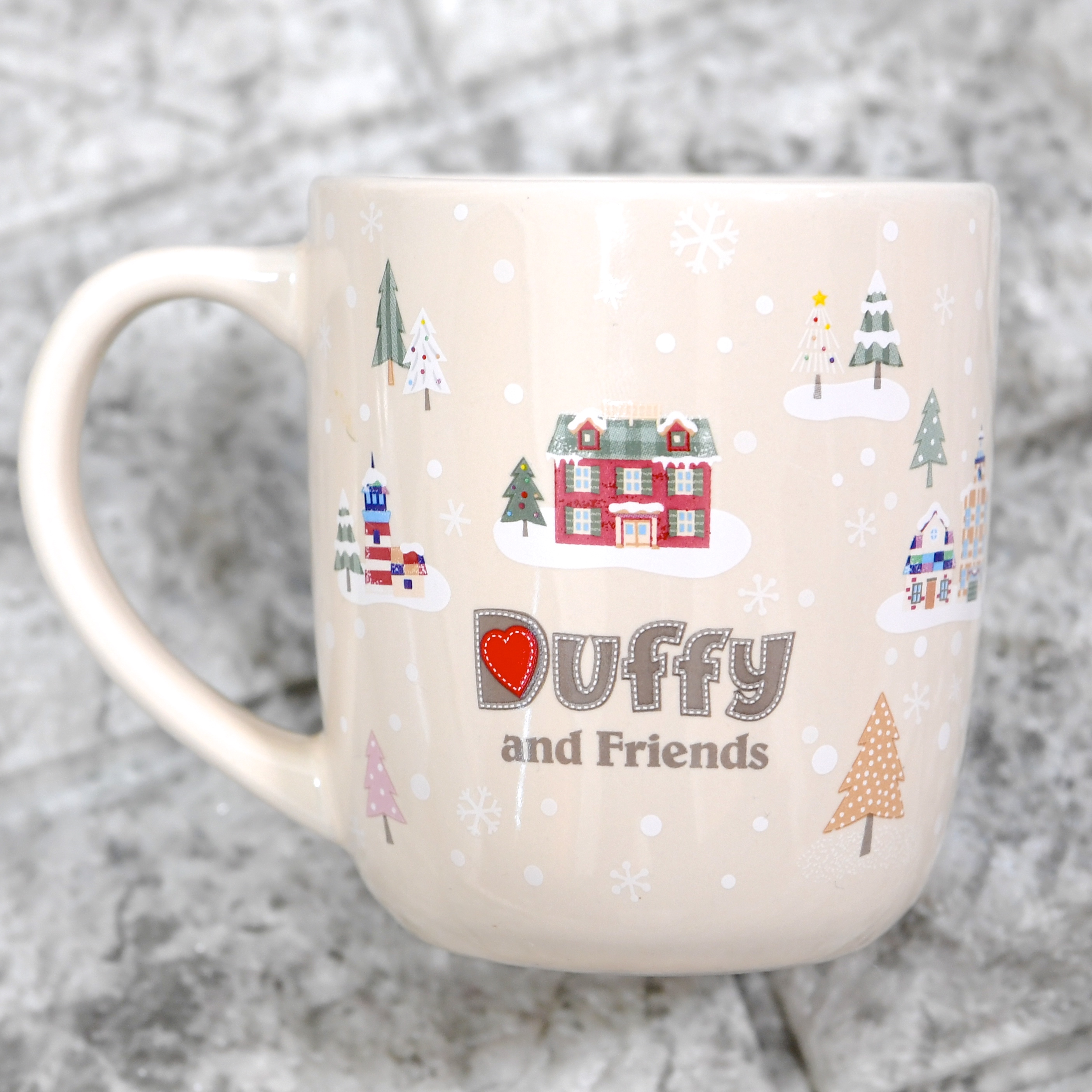 ふわもこフードをかぶった「ダッフィー&フレンズ」のお顔と雪化粧のケープコッドの町並みが描かれたスーベニアカップ。