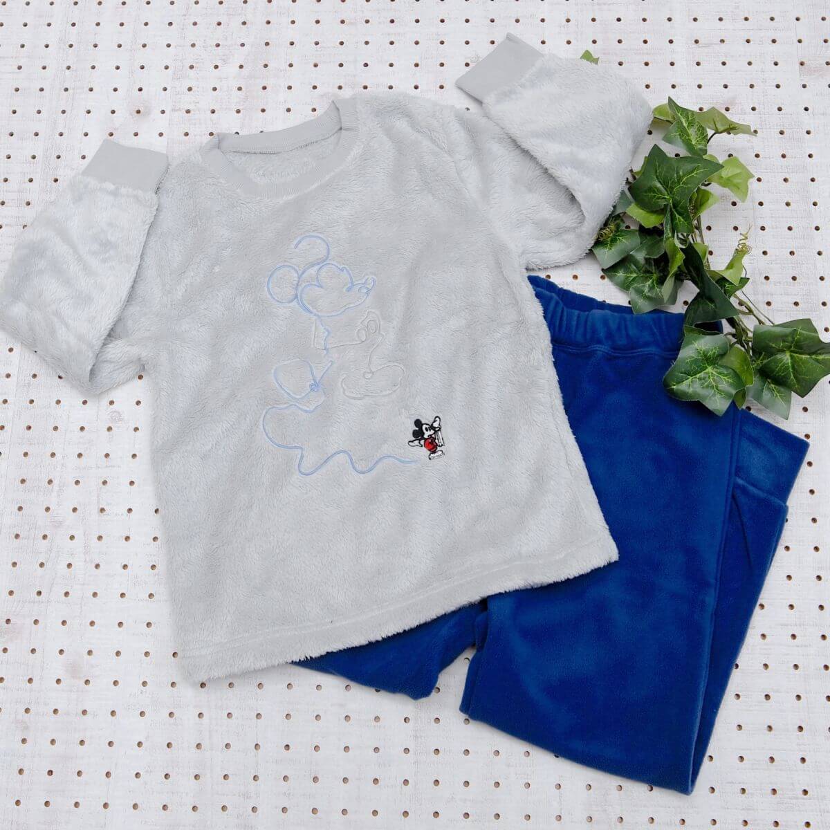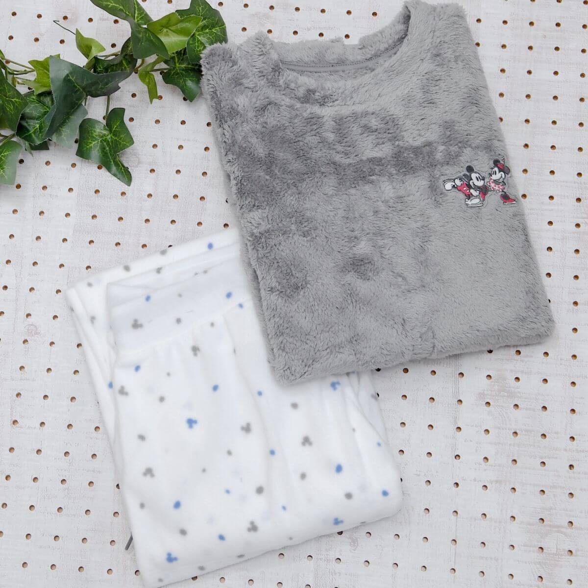 グレーのトップスと白色にミッキーマークがデザインされたボトムスのセット。