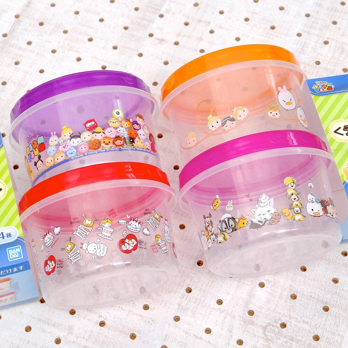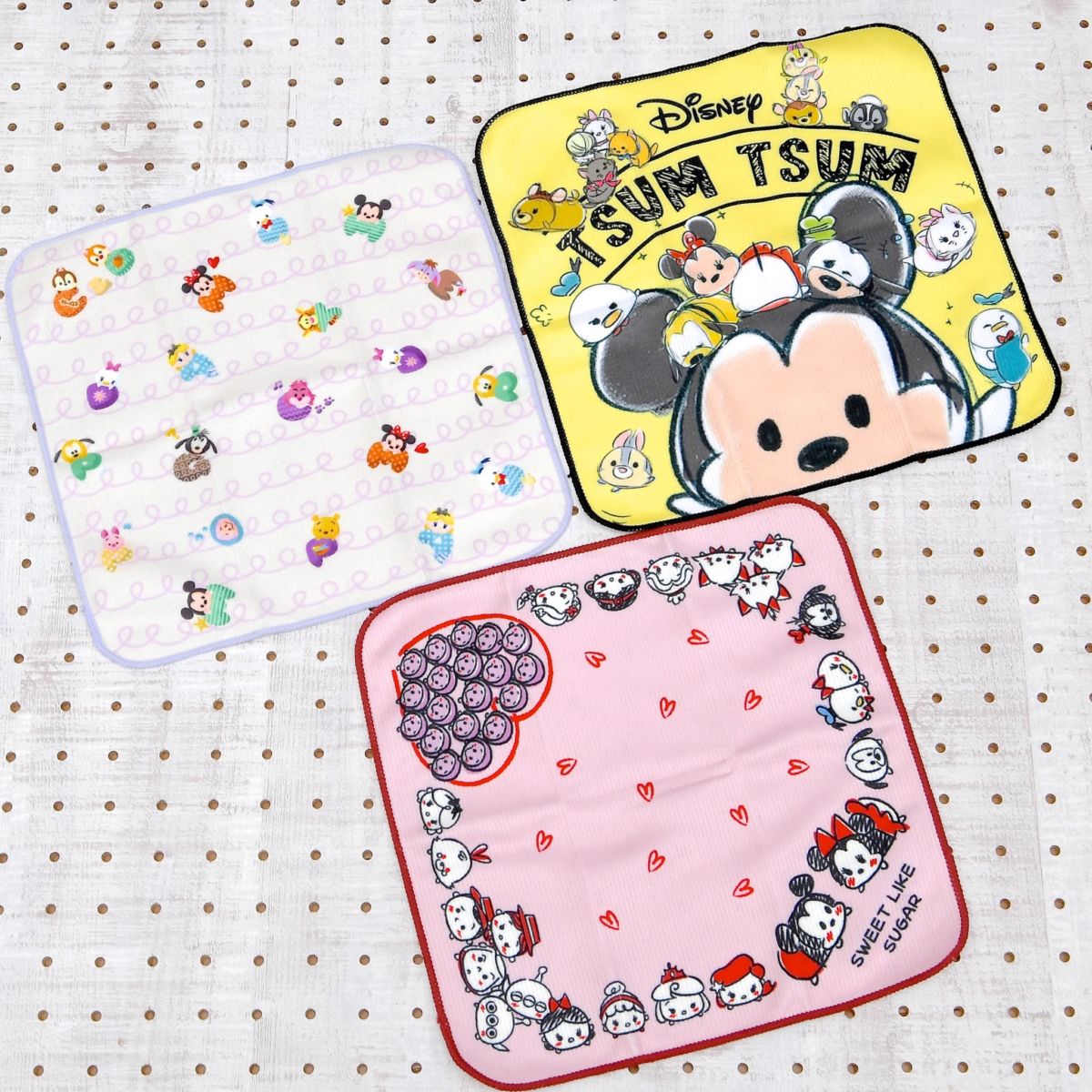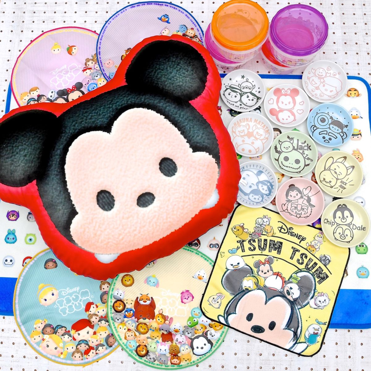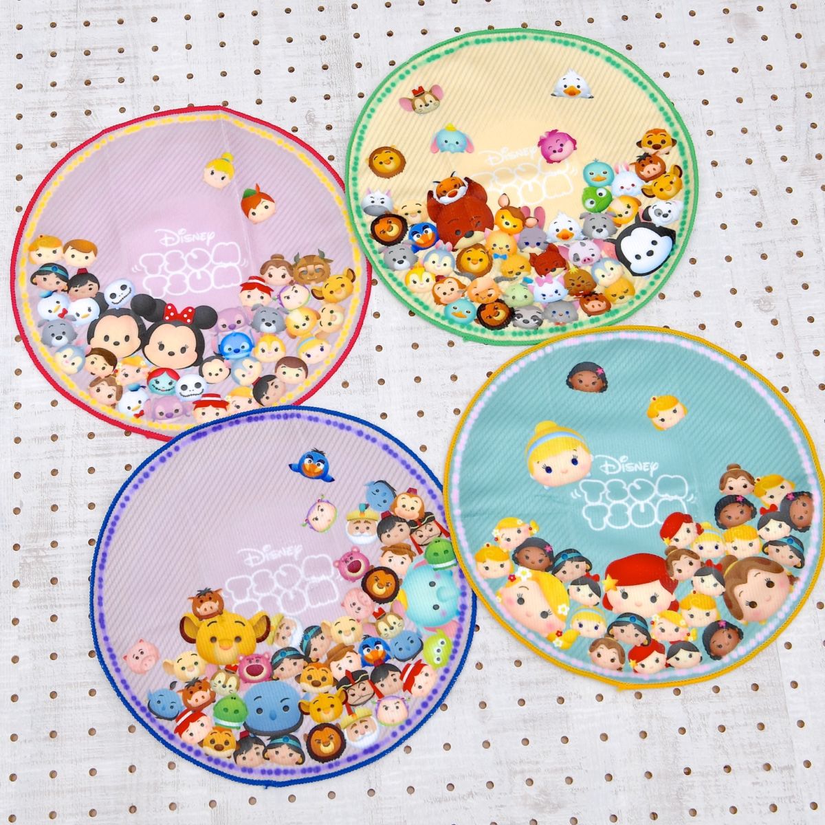 それぞれ色々なツムたちがいっぱいデザインされた丸いタオル4種と