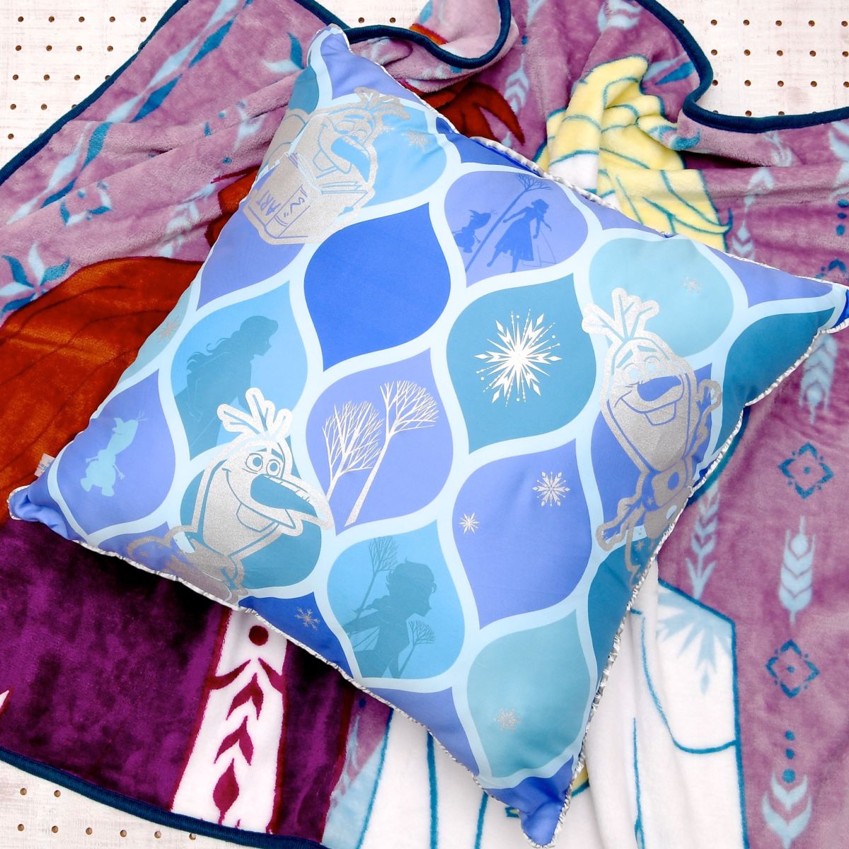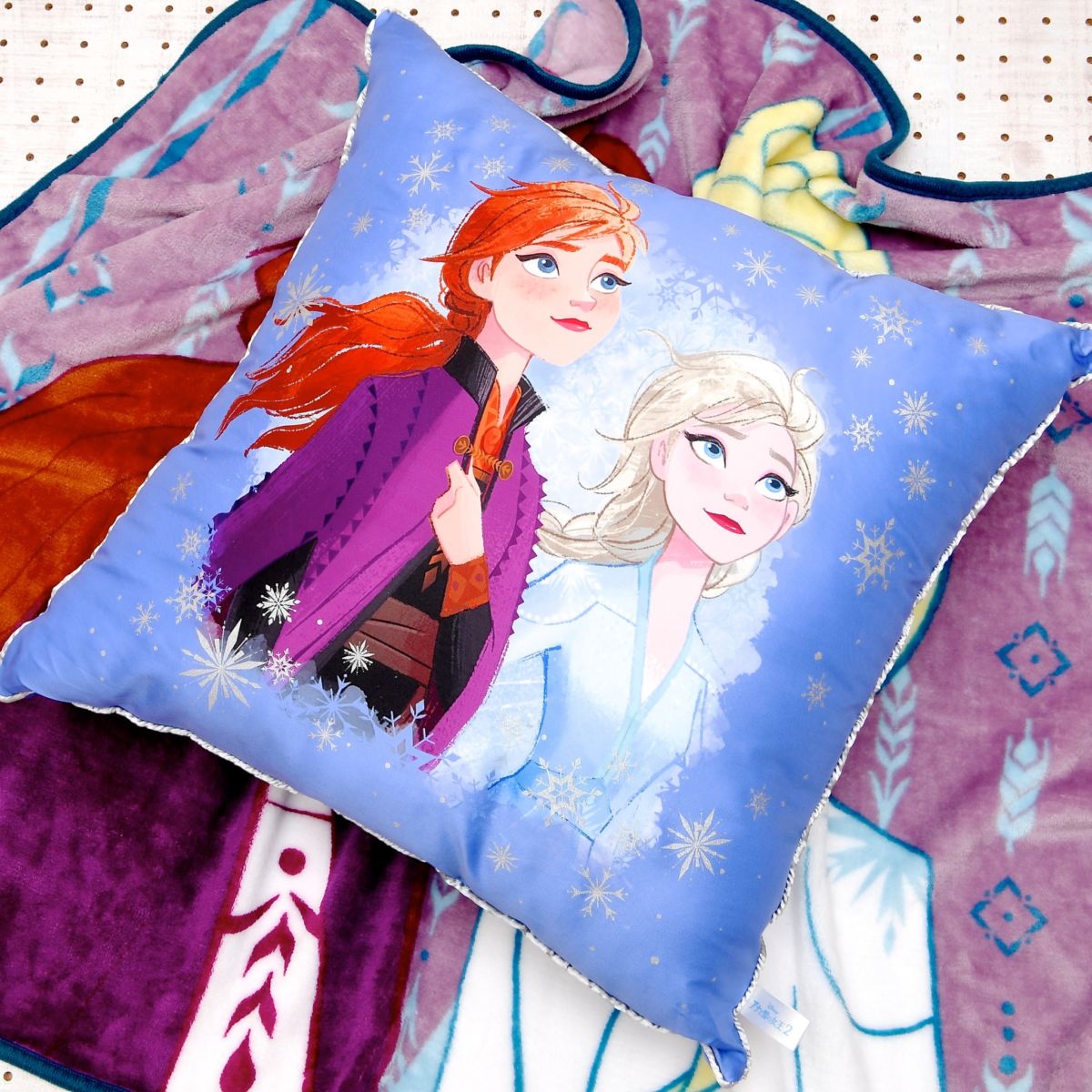 「アナ」と「エルサ」をプリントした大きめサイズのクッション。