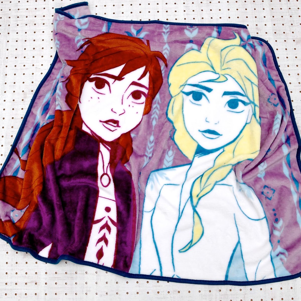 「アナ」と「エルサ」のイラストが大きくプリントされたブランケット。