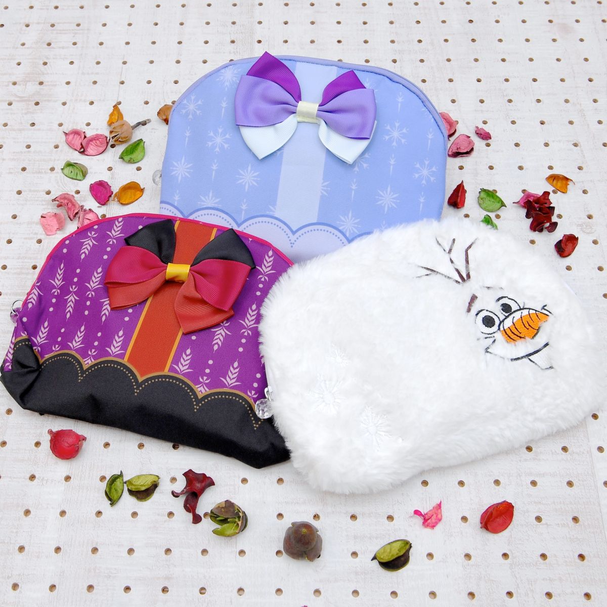 「アナ」、「エルサ」、「オラフ」をイメージしたポーチ3種。
