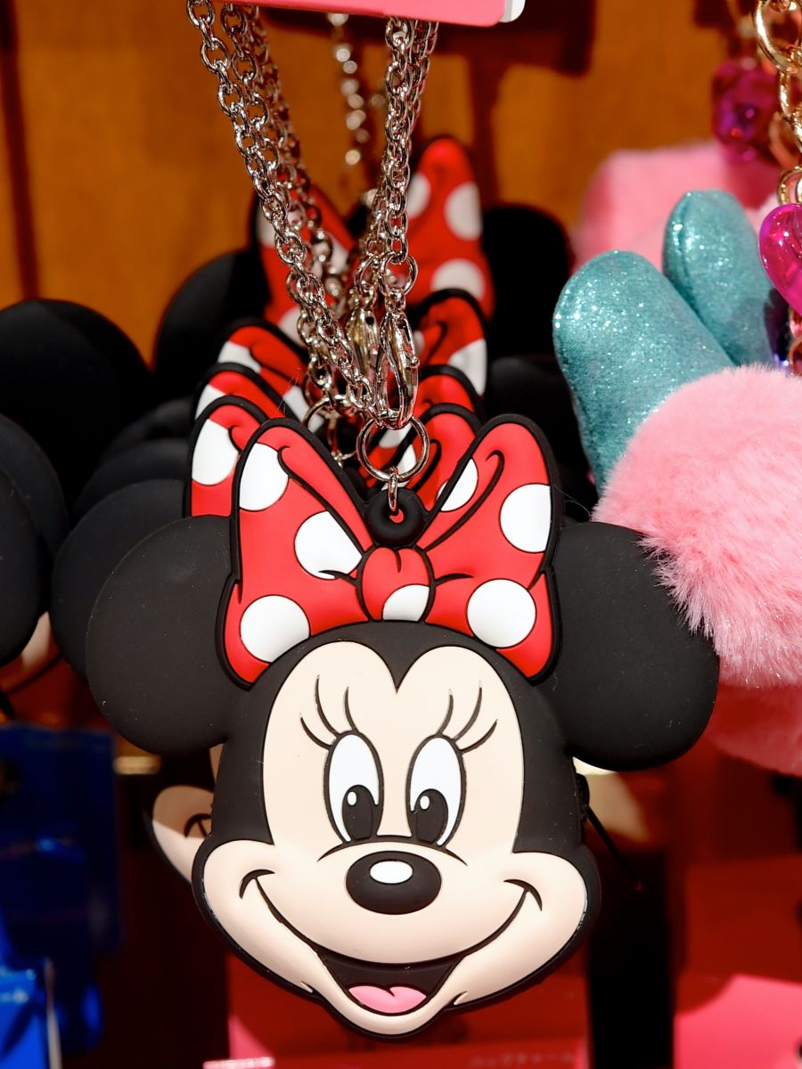 ドット柄のリボンをつけたミニーのお顔型バッグチャーム。