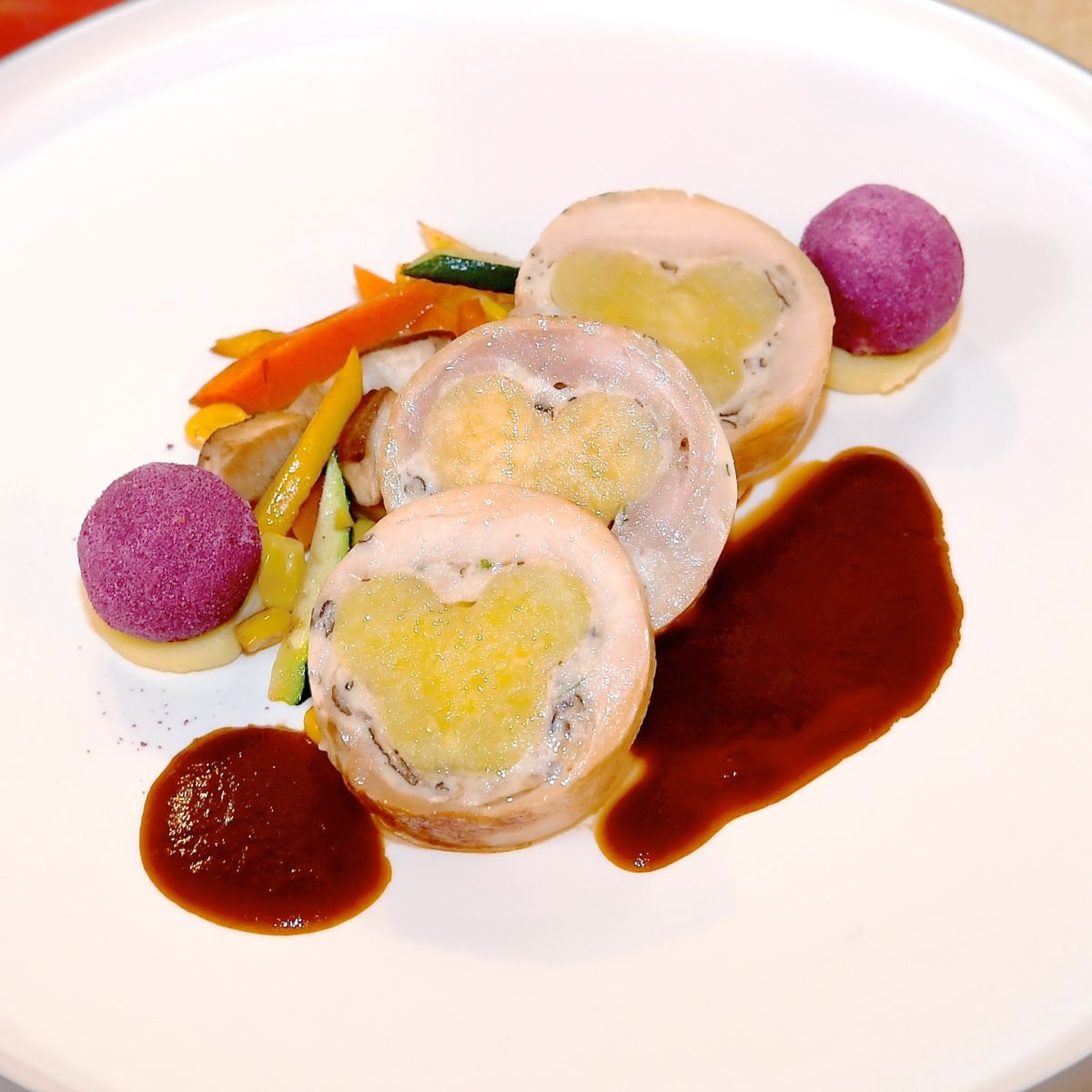 じっくり仕上げた阿波踊りチキンと鳴門金時のルーラード、サツマイモボールフライと野菜ソテーのグレイビーソース添え