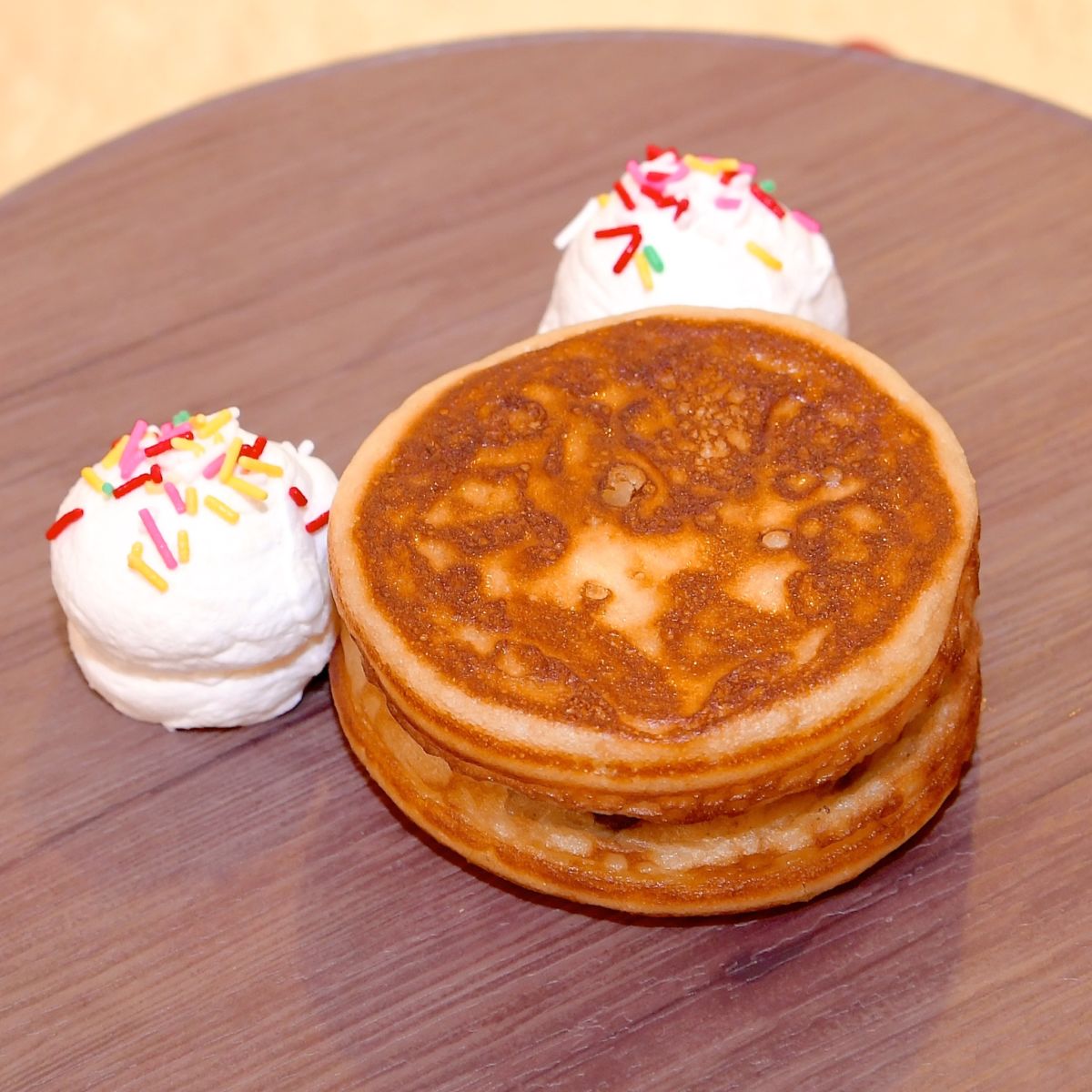 ミッキーシェイプのホイップクリームがかわいいパンケーキ。