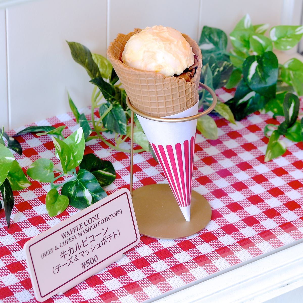 アイスクリームのような楽しい見た目の牛カルビコーン(チーズ&マッシュポテト)を紹介します☆