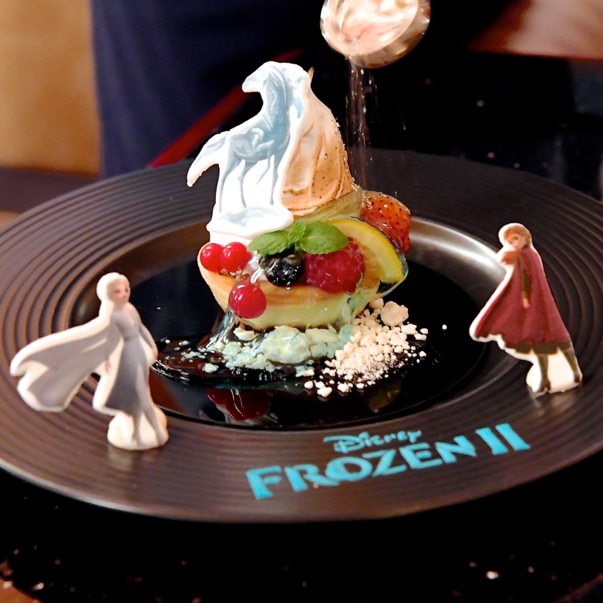ブルーキュラソーシロップのゼリーや雪をイメージしたホワイトチョコレートのパウダーも添えられ映画の世界に浸れます☆