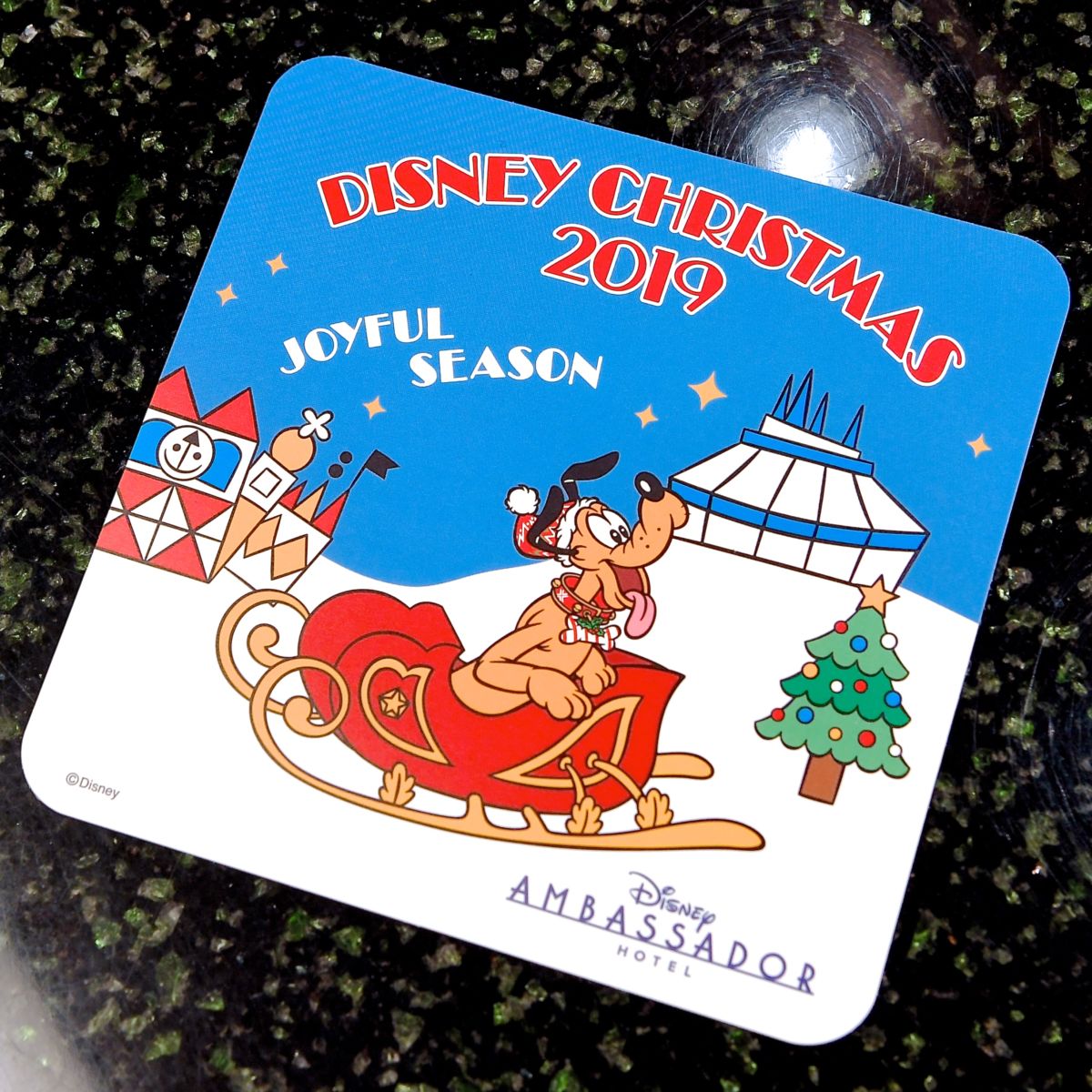 コースターにはソリにのったプルート、東京ディズニーランドのアトラクション「イッツ・ア・スモールワールド」、「スペース・マウンテン」がデザインされています。