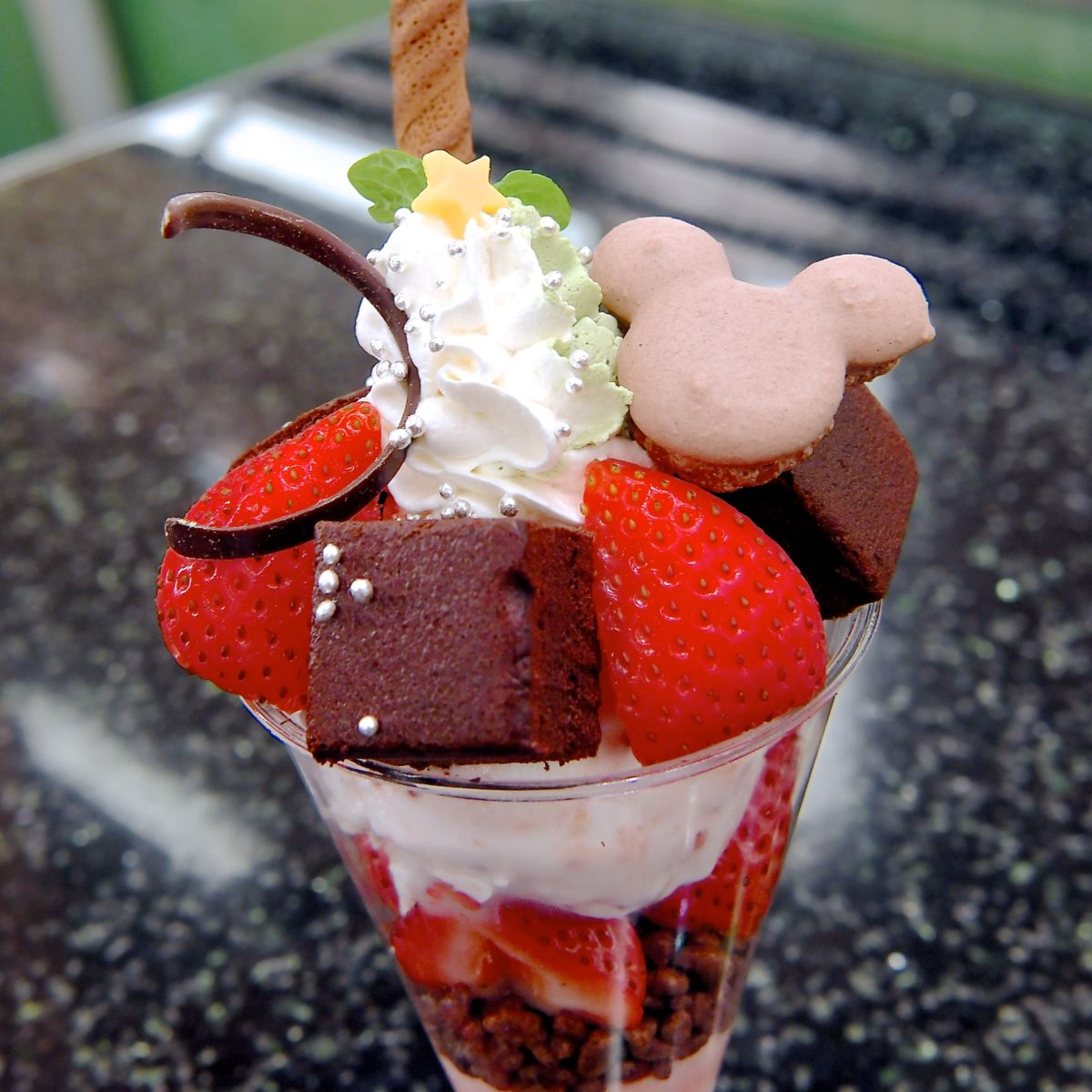 ミッキーシェイプのマカロン、まるでクリスマスツリーのようなホイップクリームがトッピングされた見た目も楽しめるパフェです!