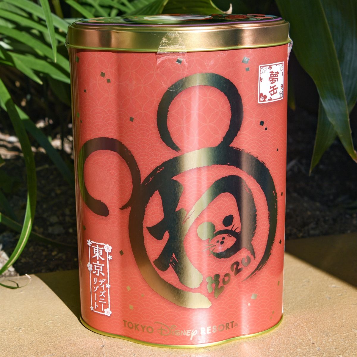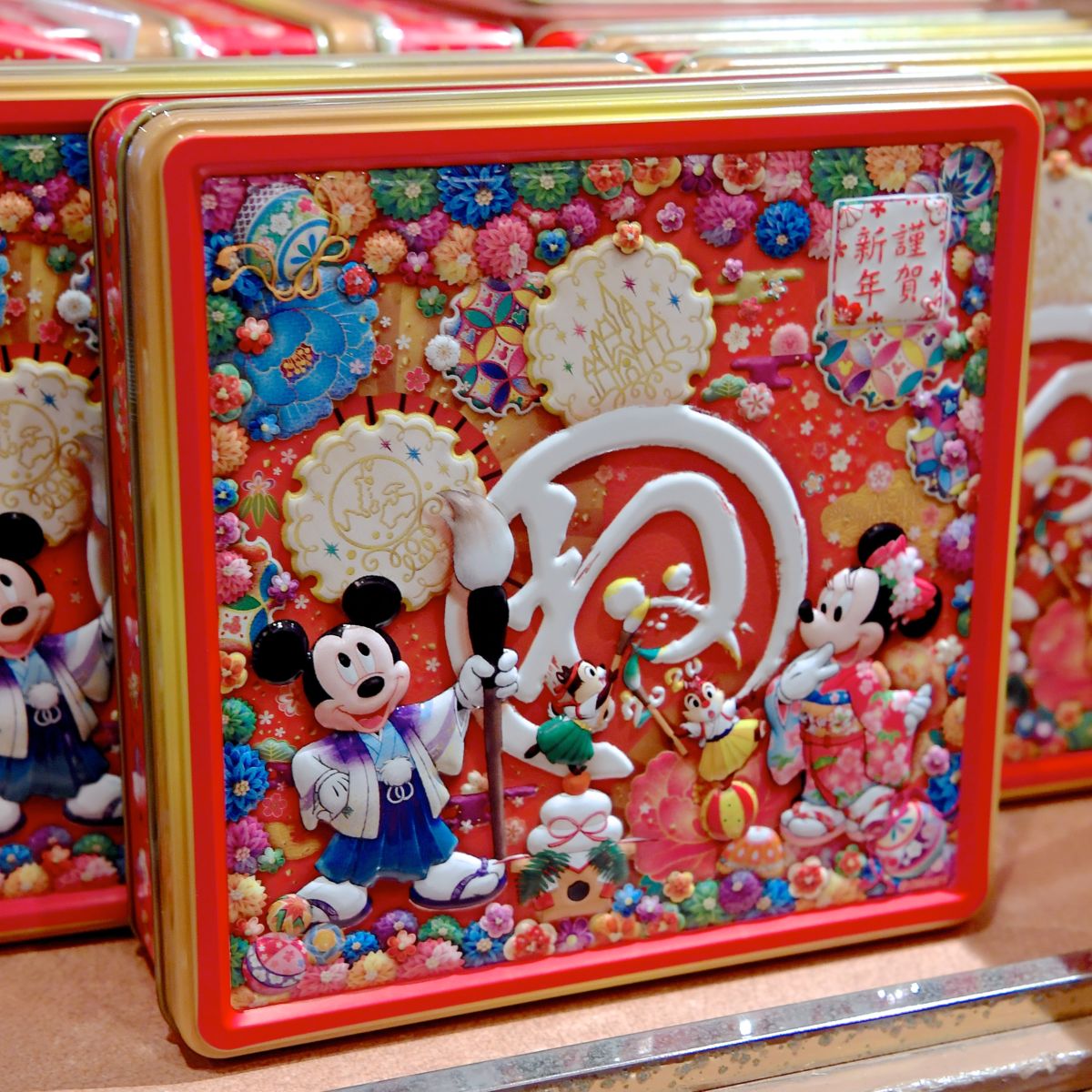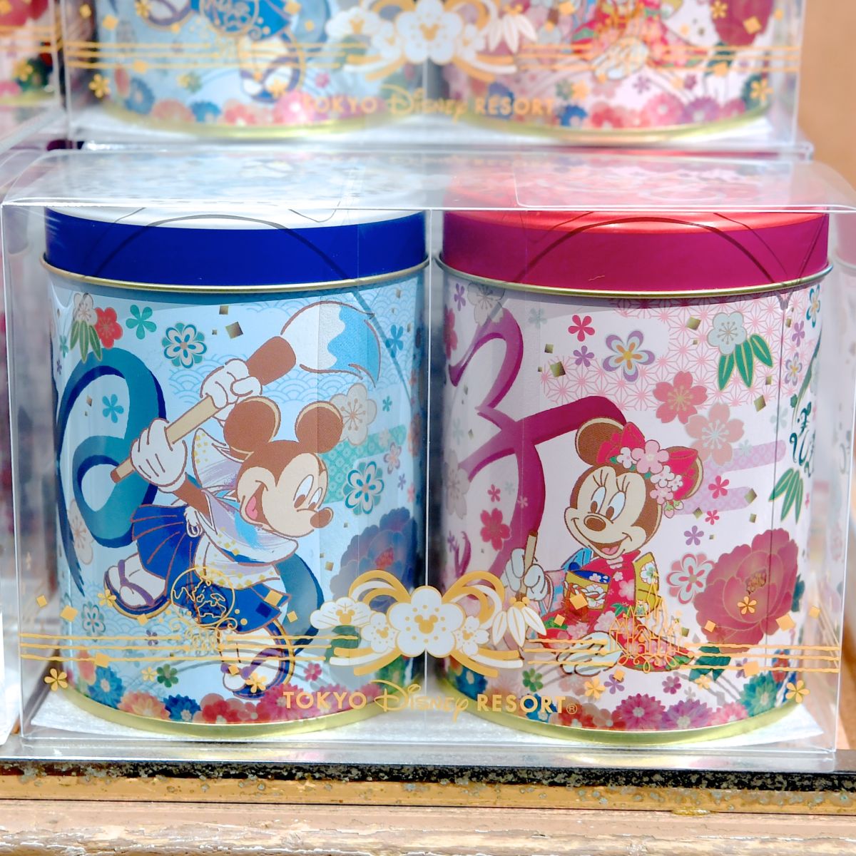 元気いっぱいに"ね"を描くミッキーとおしとやかに"子"を描くミニーがデザインされた缶入りの海苔スナックのお土産。