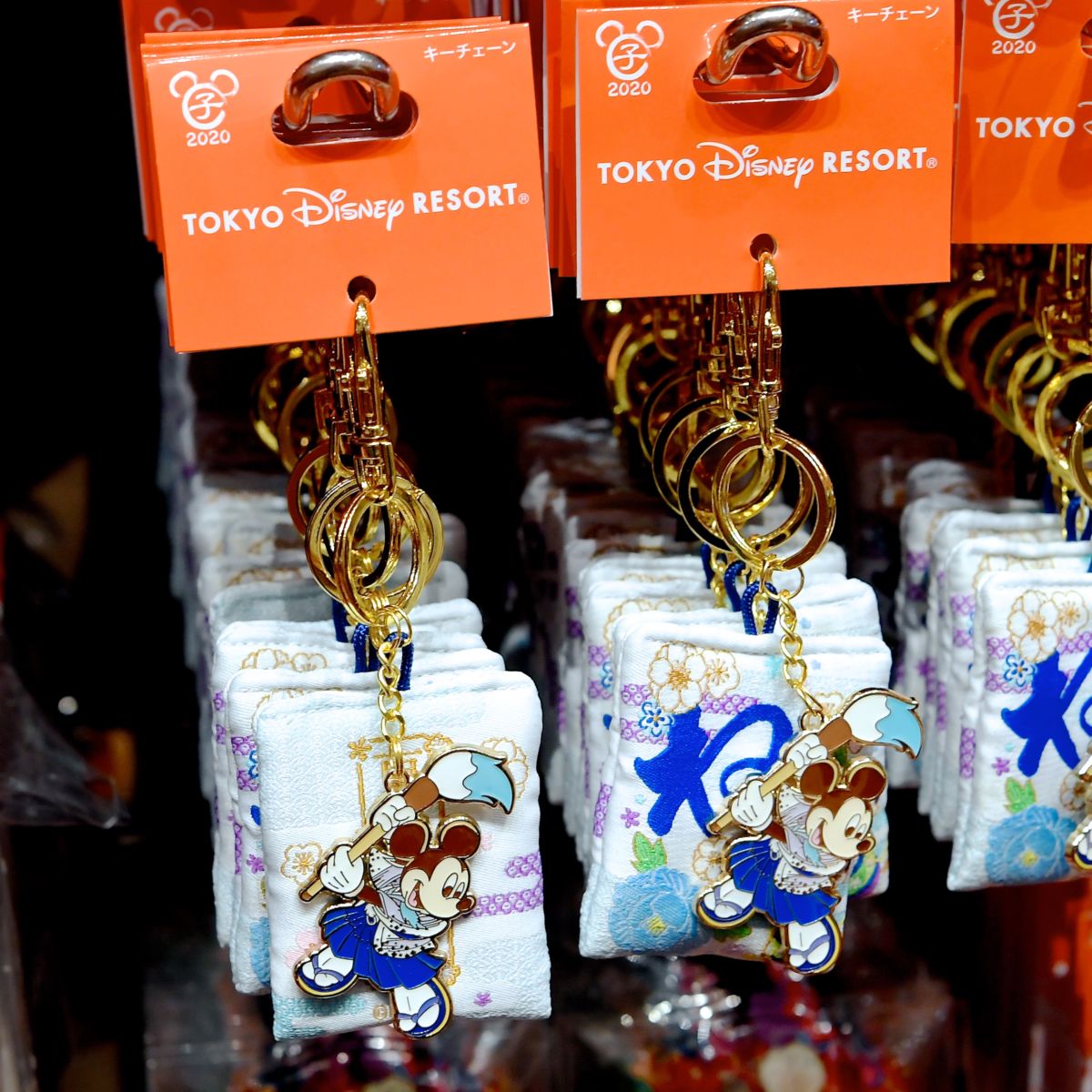 筆を持った和装ミッキー、ねデザインのマスコットが付いたキーチェーン。