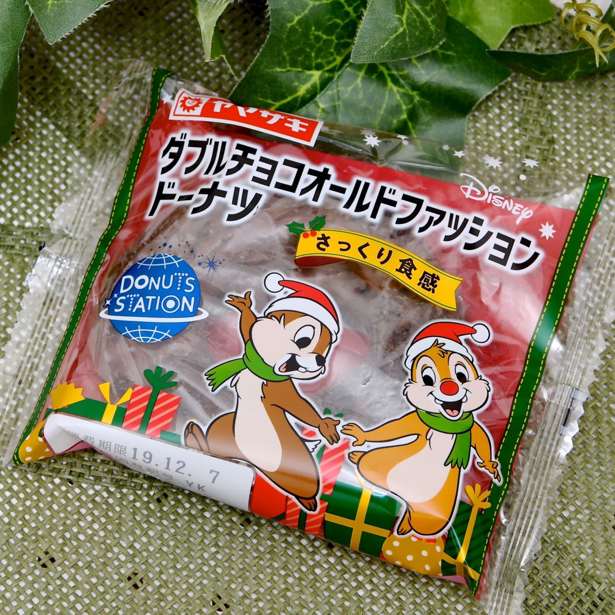 ダブルチョコオールドファッションドーナツはサンタ帽をかぶったチップ&デールデザインパッケージ。