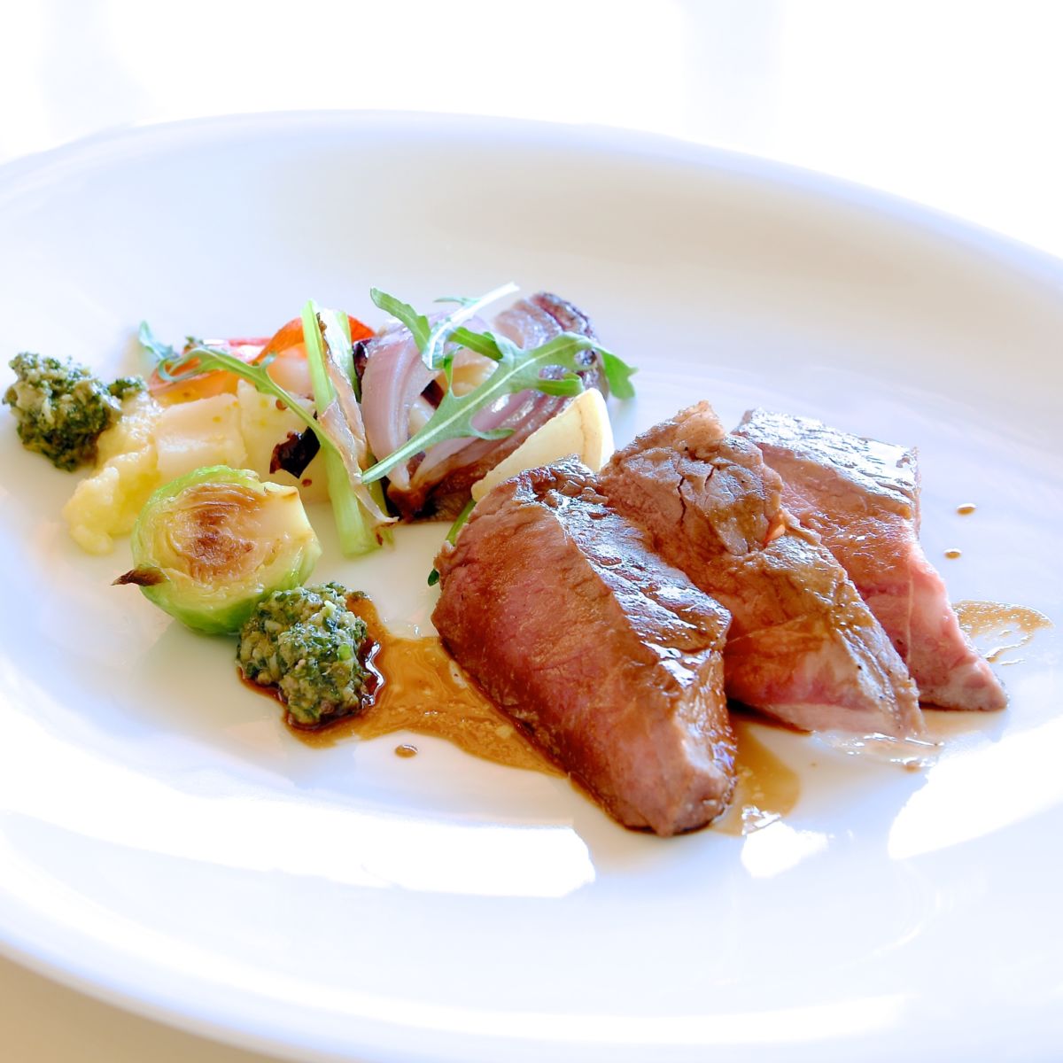 牛サーロインのタリアータとセージ風味のポレンタ サルサヴェルデと季節野菜