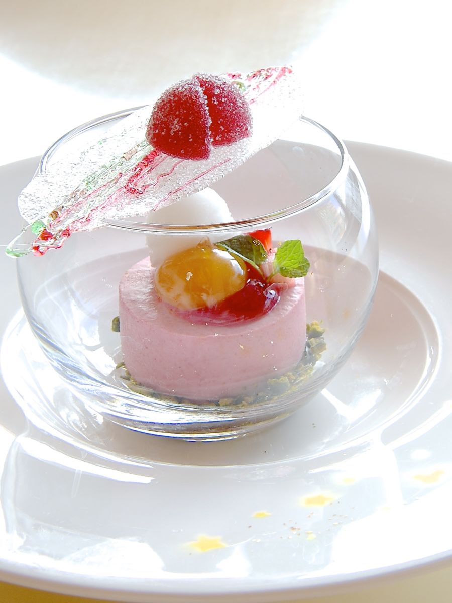 赤い果実のムースと白ワイン風味のレモンソルベ