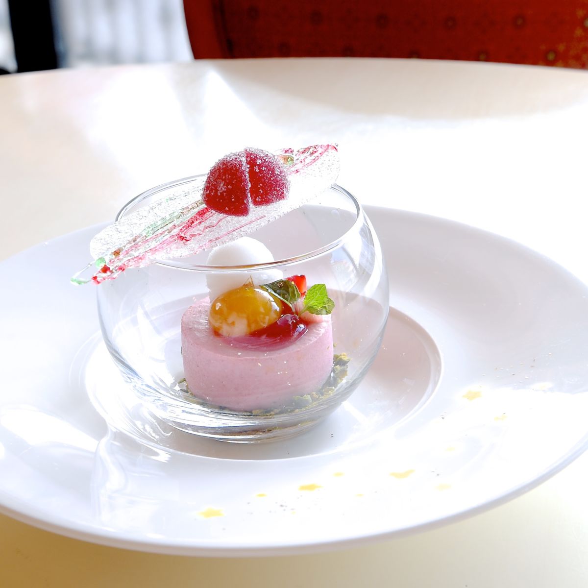 上にはトロピカルソース、白ワイン風味のレモンソルベ、さらに氷をイメージした赤と緑の飴細工、赤すぐりのグミがトッピングされています。