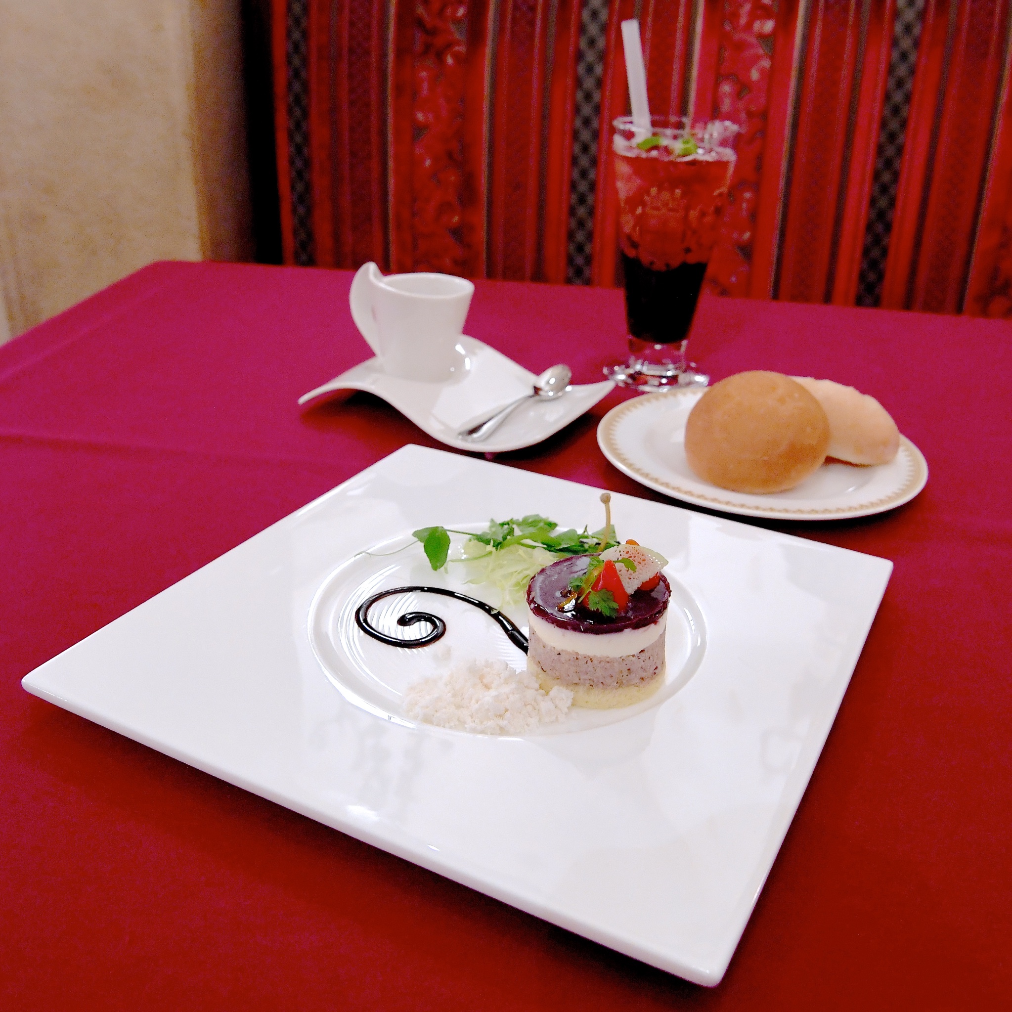 前菜は「合鴨とポークとチキンのガトー仕立て、コンソメスープ」