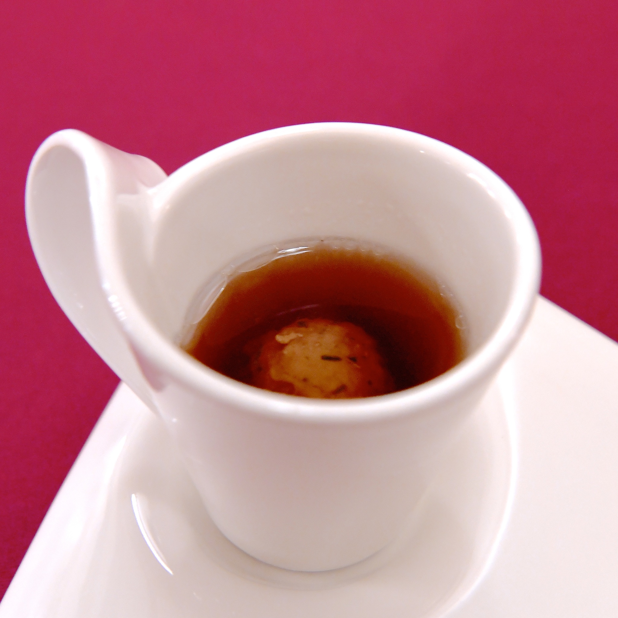 ・合鴨とポークとチキンのガトー仕立て、コンソメスープ