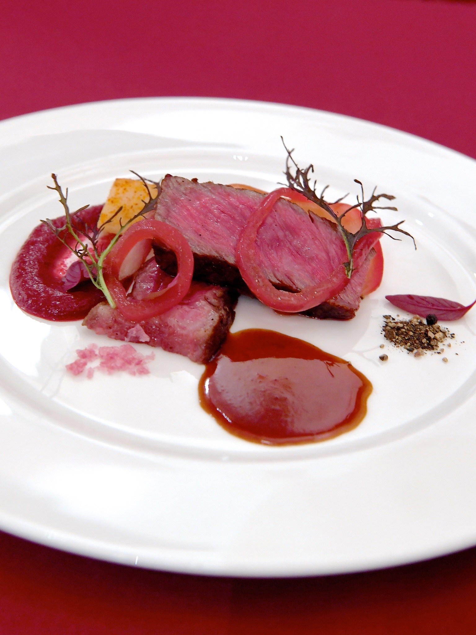 マルサラソース、ビーツのピューレ、お塩で上品にいただけます。