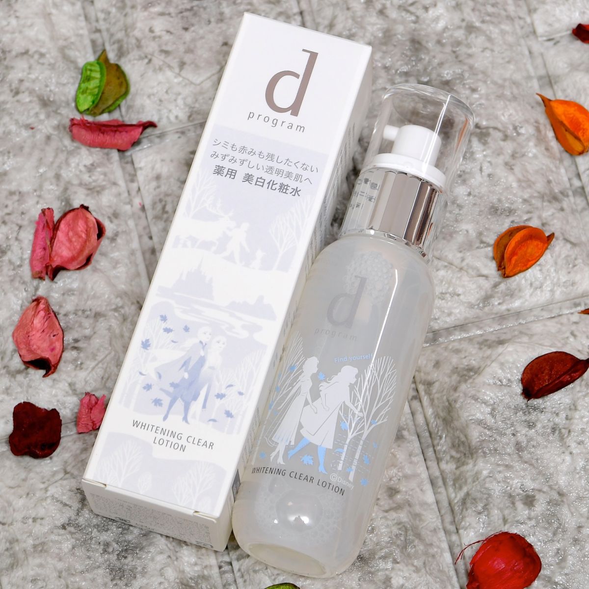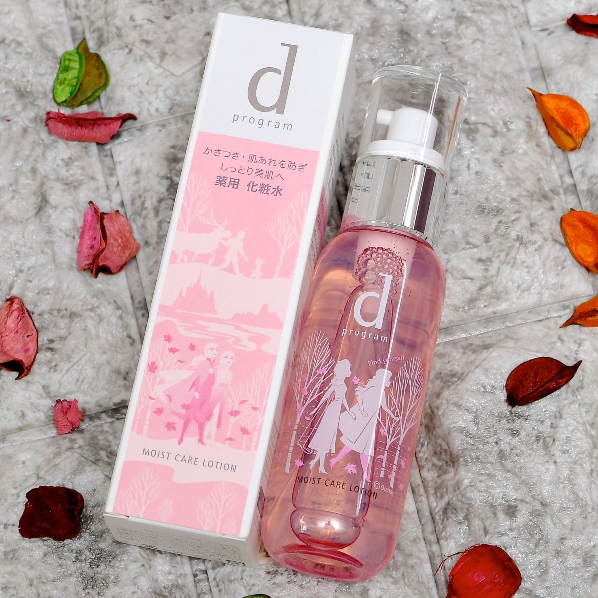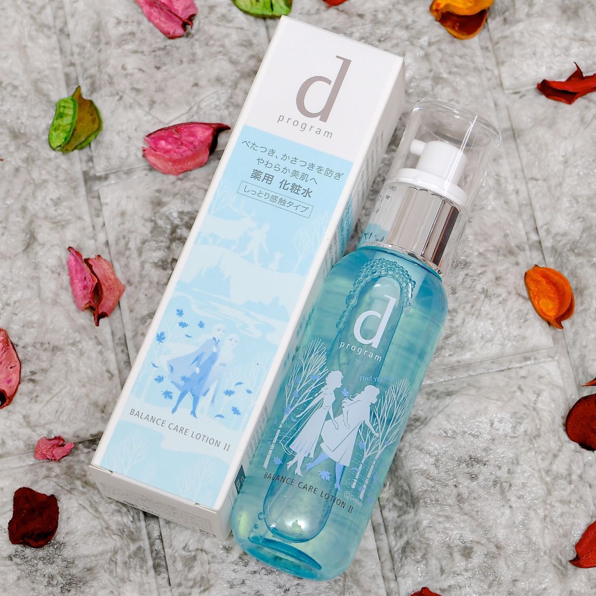 アナとエルサ、オラフ、クリストフ、スヴェンのシルエットが描かれたパッケージ入りの「dプログラム」の化粧水。