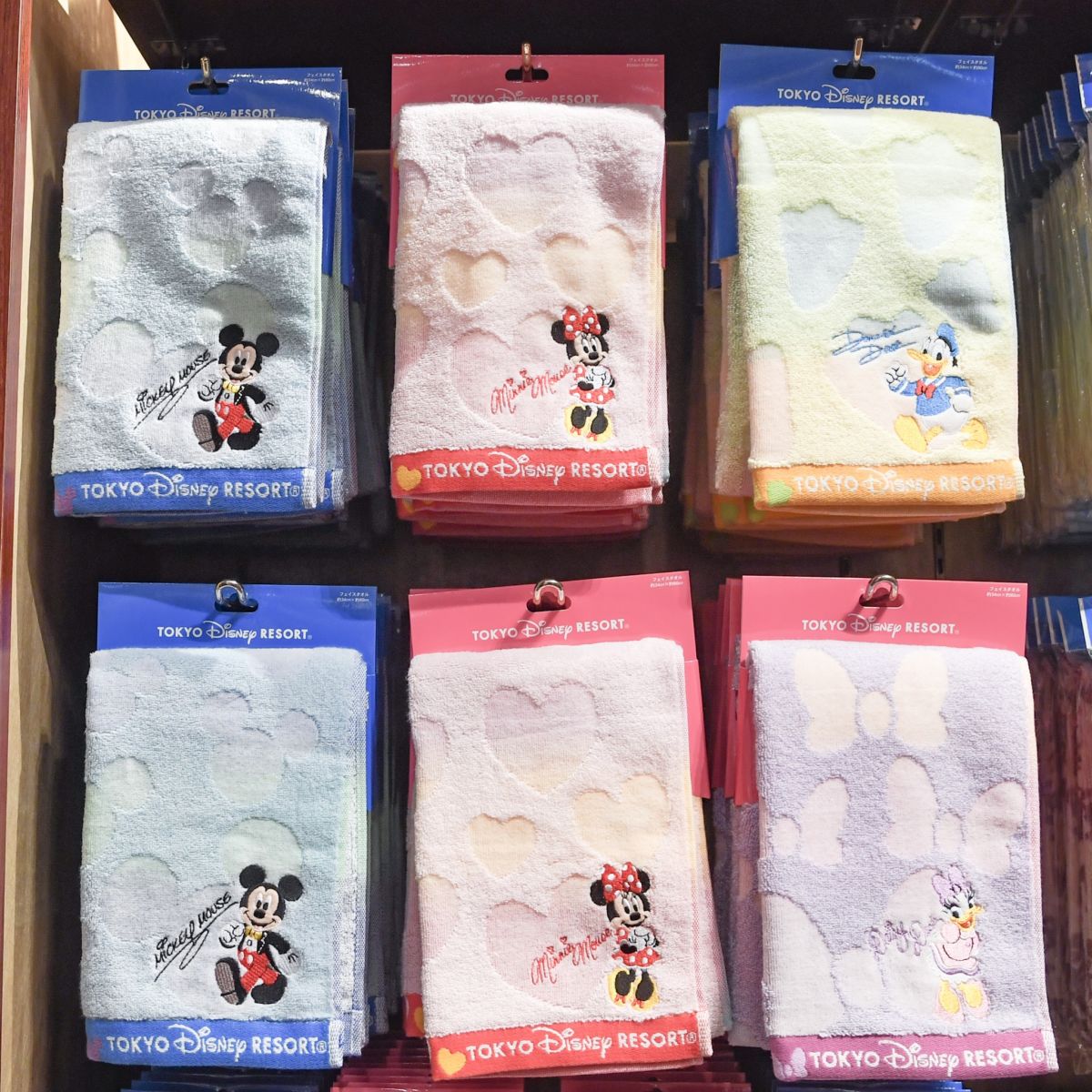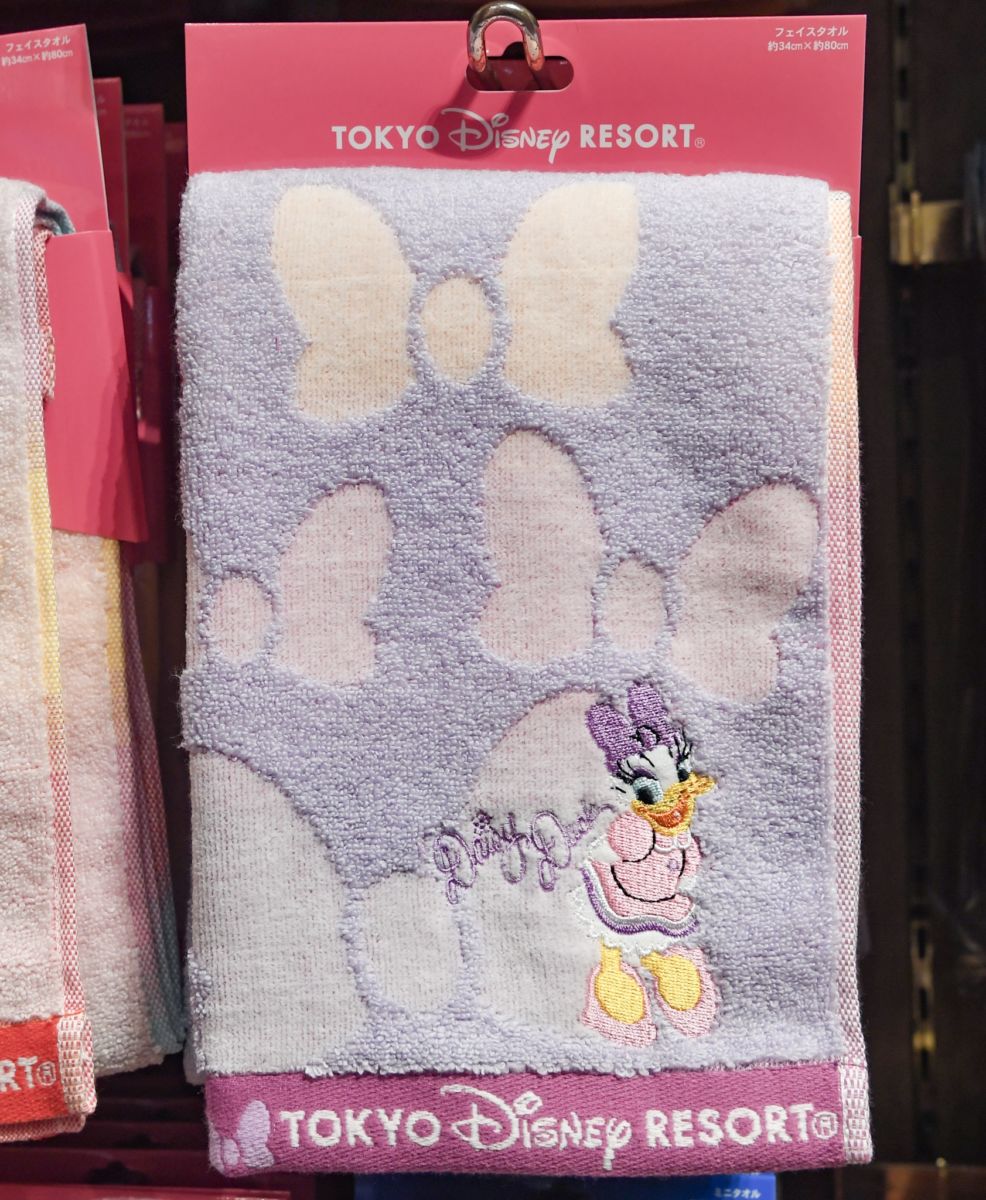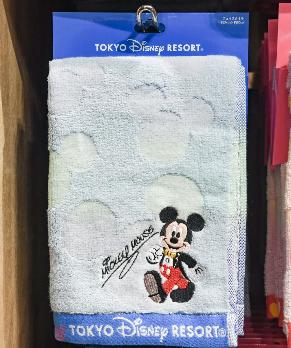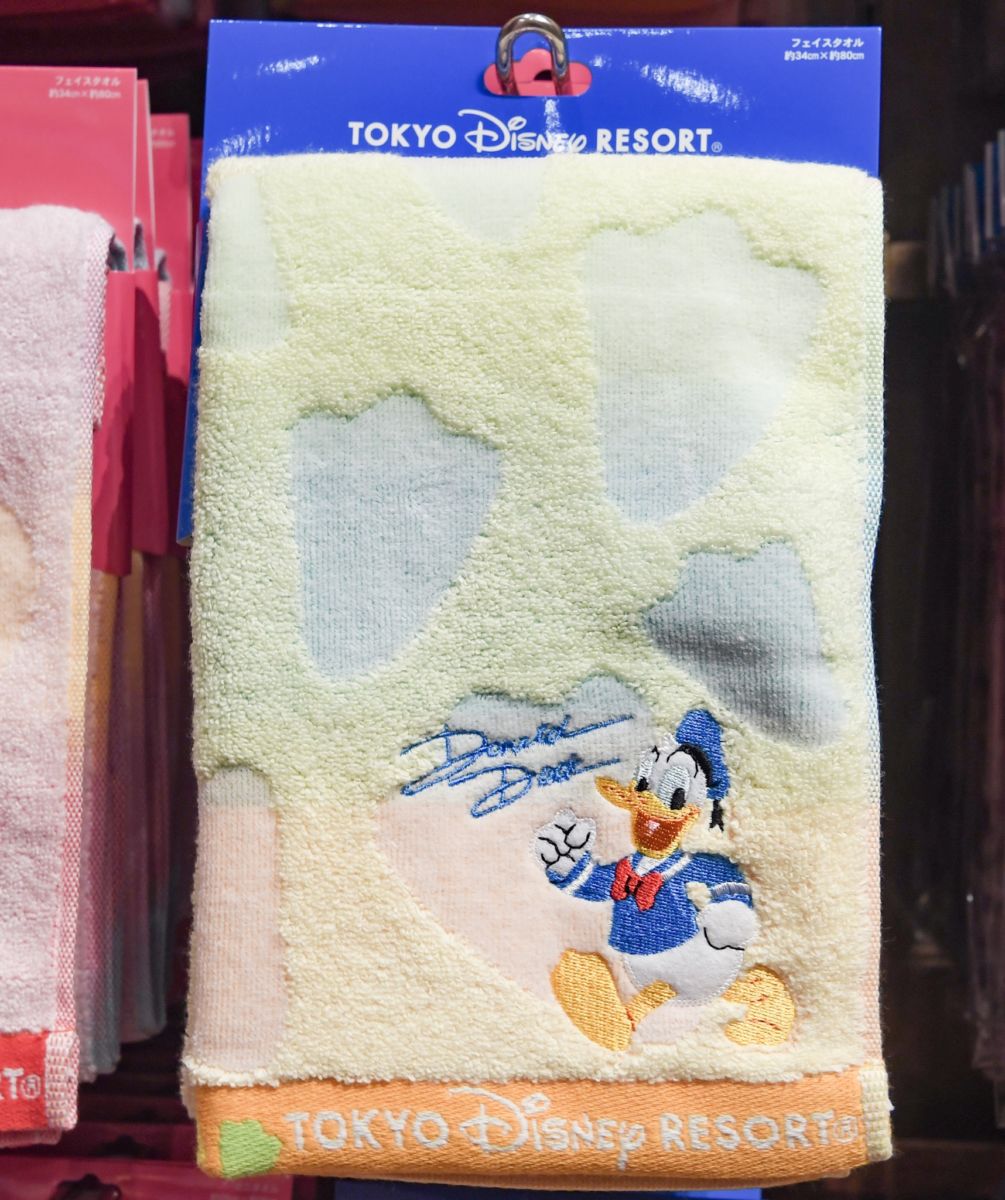 東京ディズニーランド、東京ディズニーシーの定番グッズ、ディズニーキャラクターデザインのフェイスタオル。