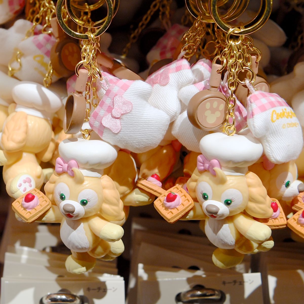ミトンやフライパンのチャームがついたクッキー・アンのマスコットキーチェーン。
