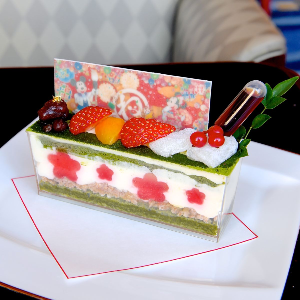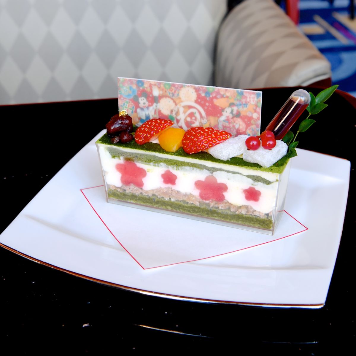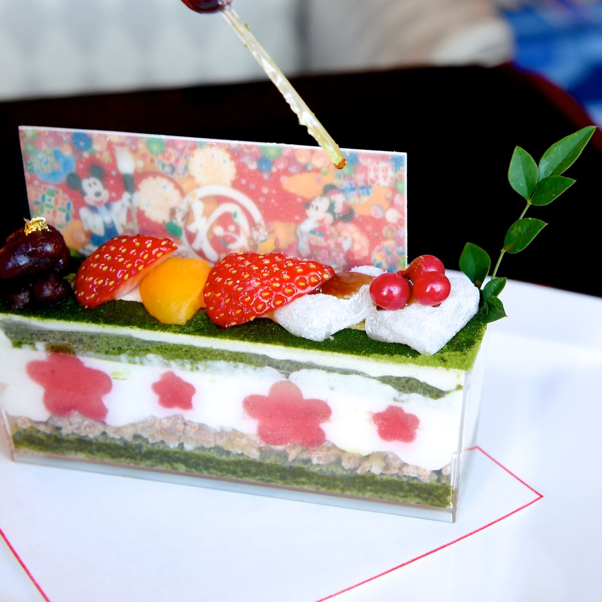 和な抹茶を使用したティラミスに求肥、小豆、フルーツ、そして書き初めをするミッキーマウス、ミニーマウス、チップ、デールがデザインされた鮮やかなチョコレートをトッピング。
