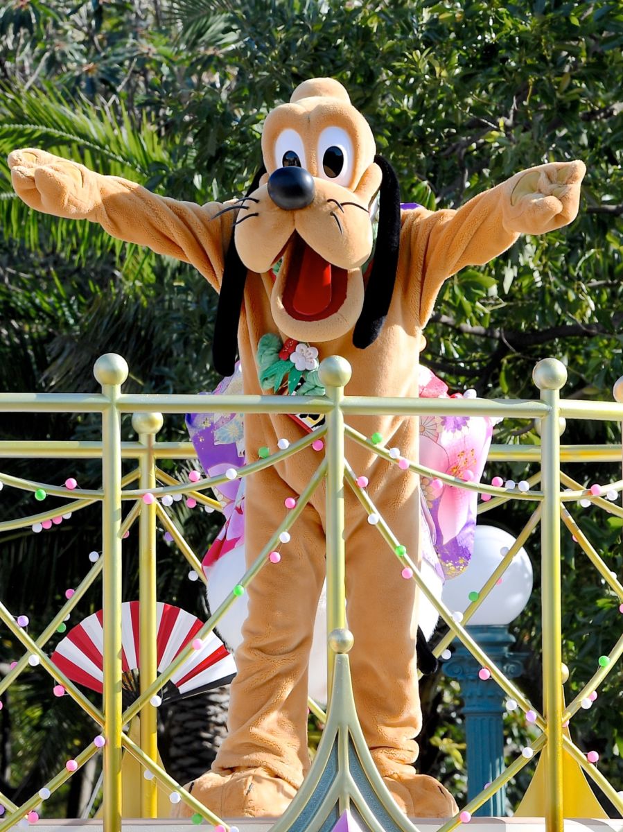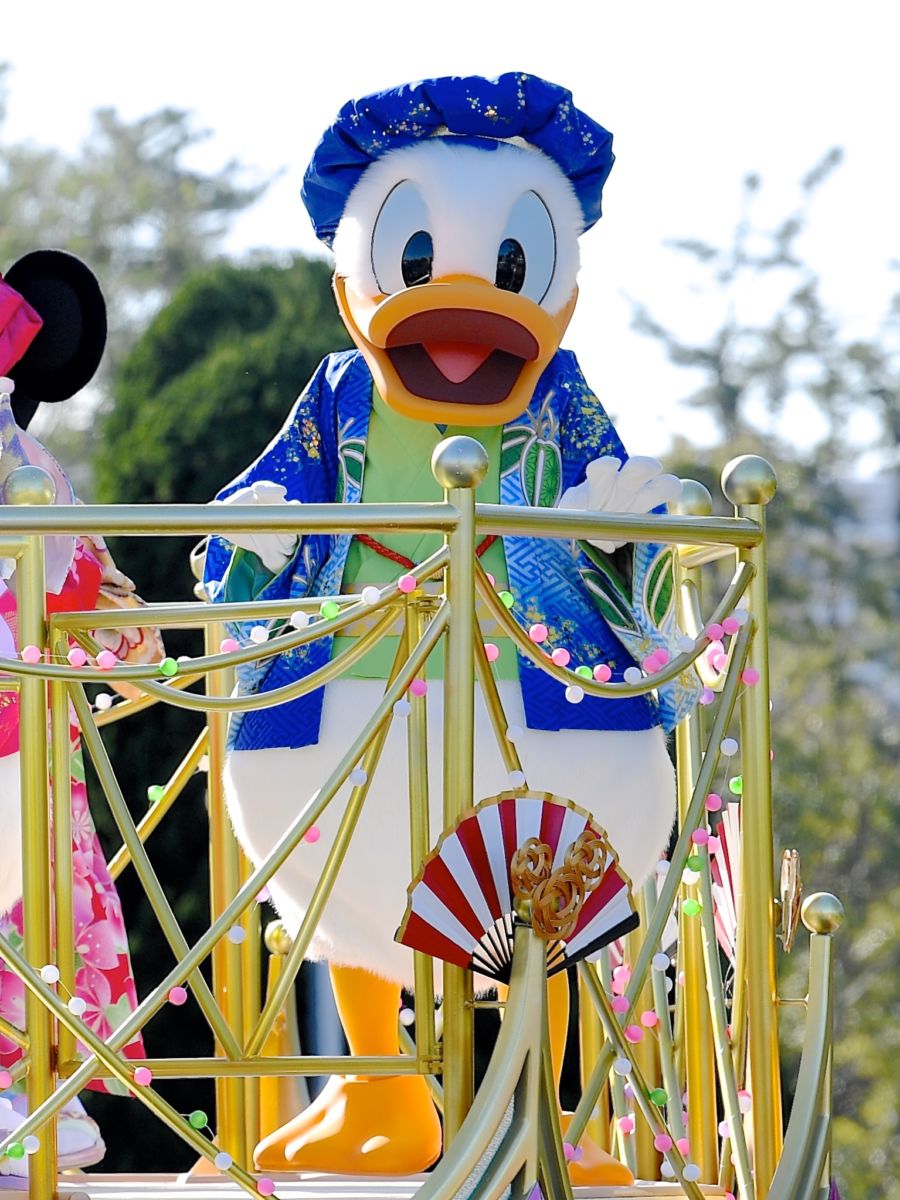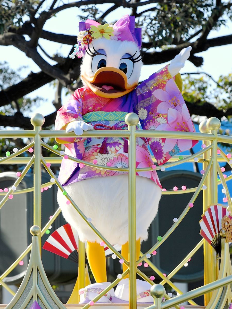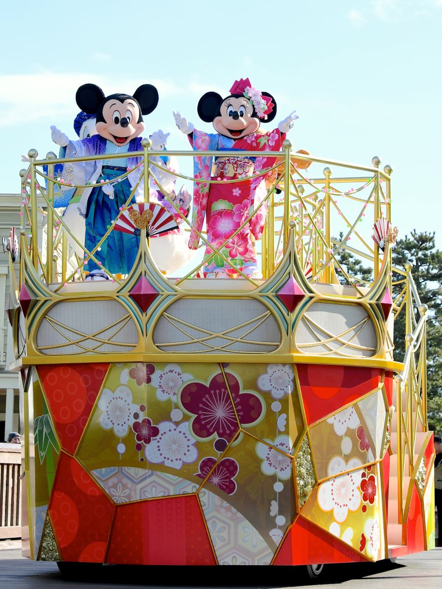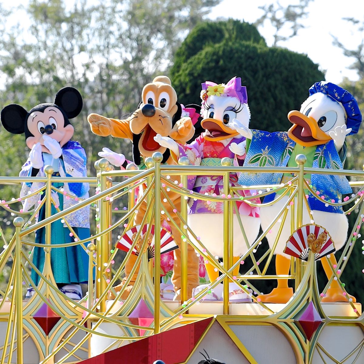 ミッキーマウス、ミニーマウス、ドナルドダック、デイジーダック、プルートが一緒にいる、お正月ならではの豪華フロートは必見です☆