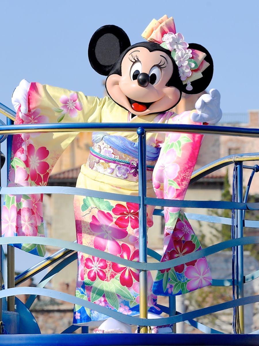 同じく主役のミニーマウスはかわいらしいピンクとイエローの着物姿。